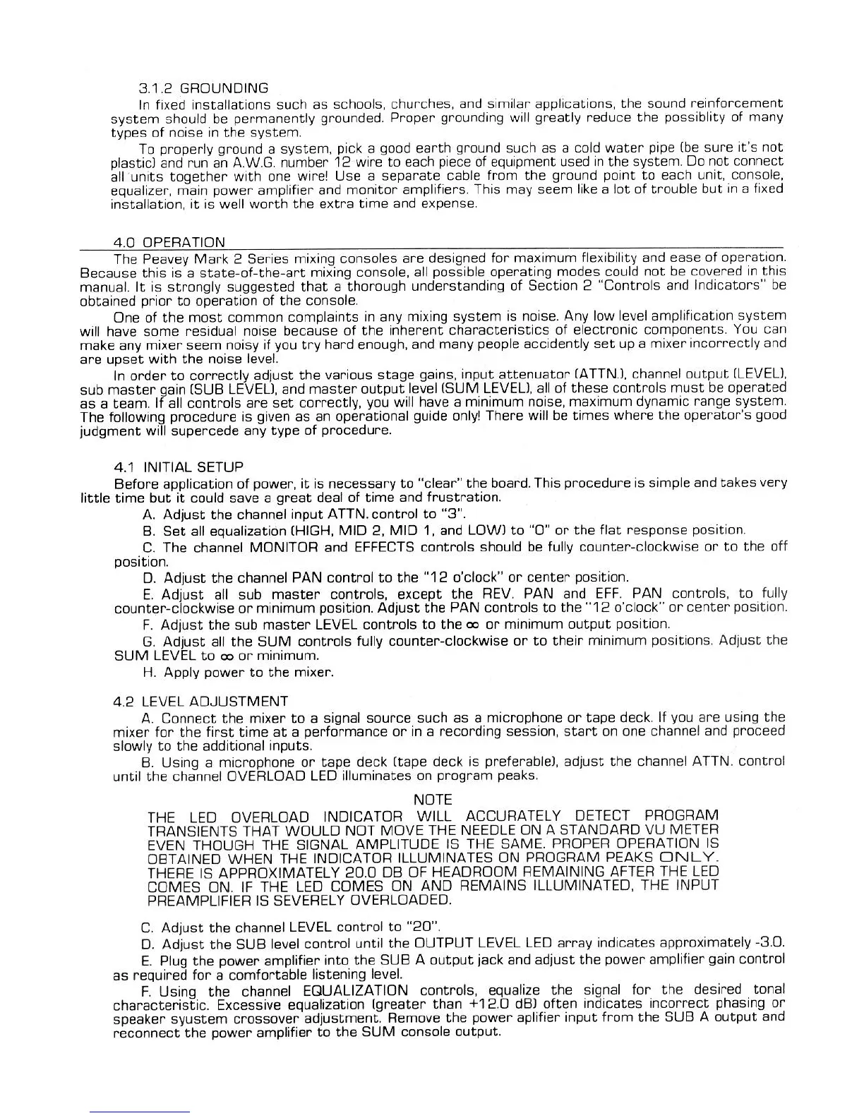 Peavey Mark MC-12 - 3.1.2 Grounding; 4.0 Operation; 4.1 Initial Setup; 4.2 Level Adjustment