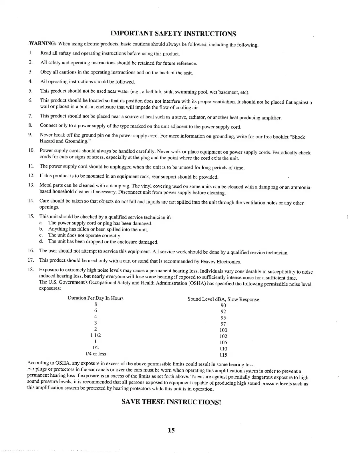 Peavey PV 260 - Important Safety Instructions; General Usage and Maintenance Safety; Hearing Protection Guidelines