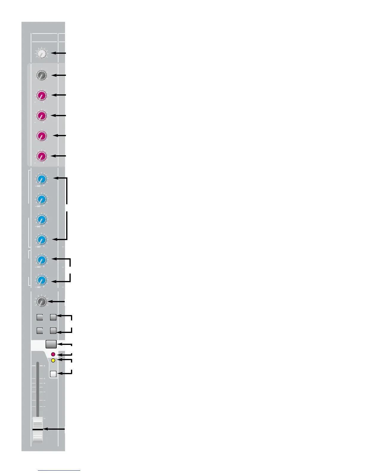 Estos controles ajustan el nivel de la señal de un canal (pre fader) que