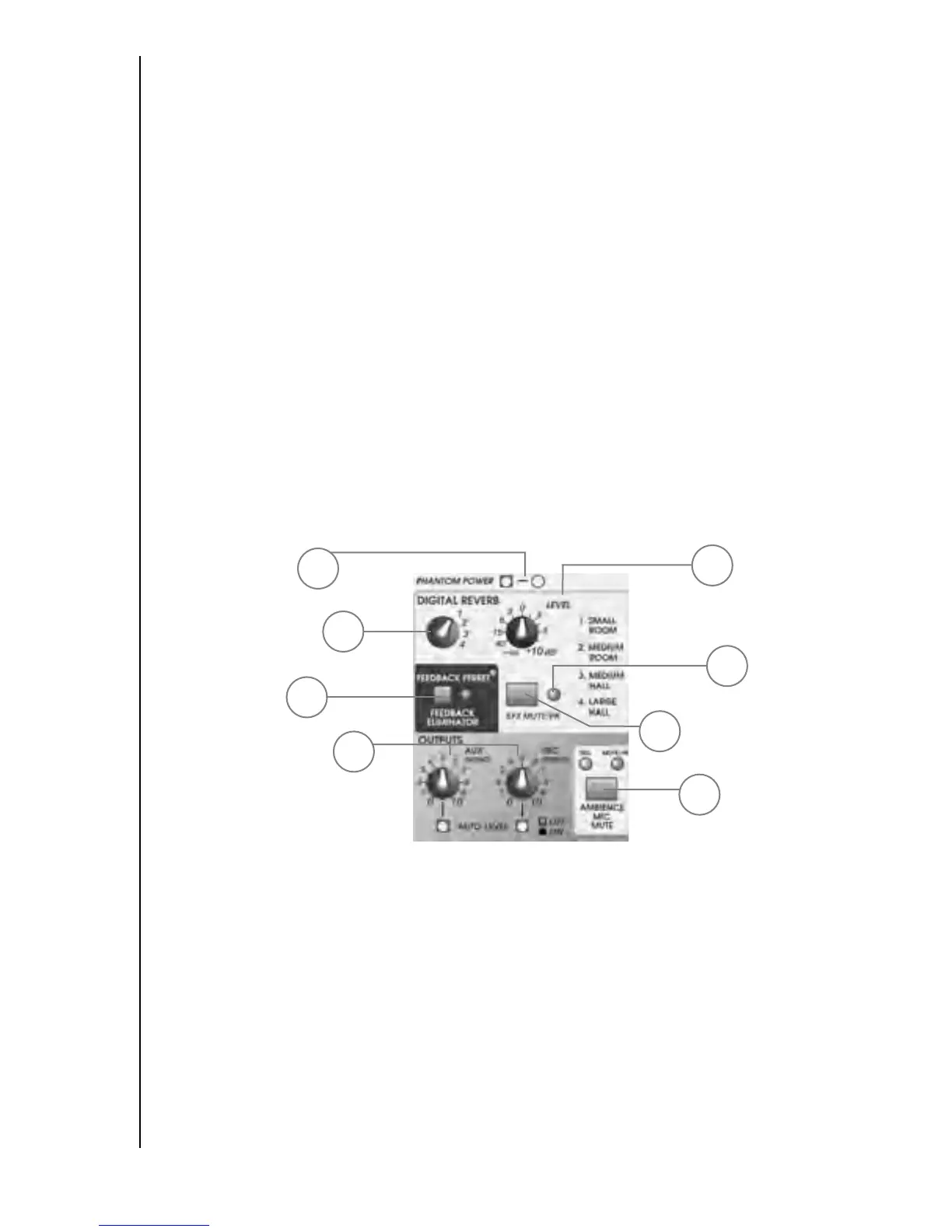 18. EFFECTS SELECT: There are four pre-programmed reverbs built into the console ranging from small to