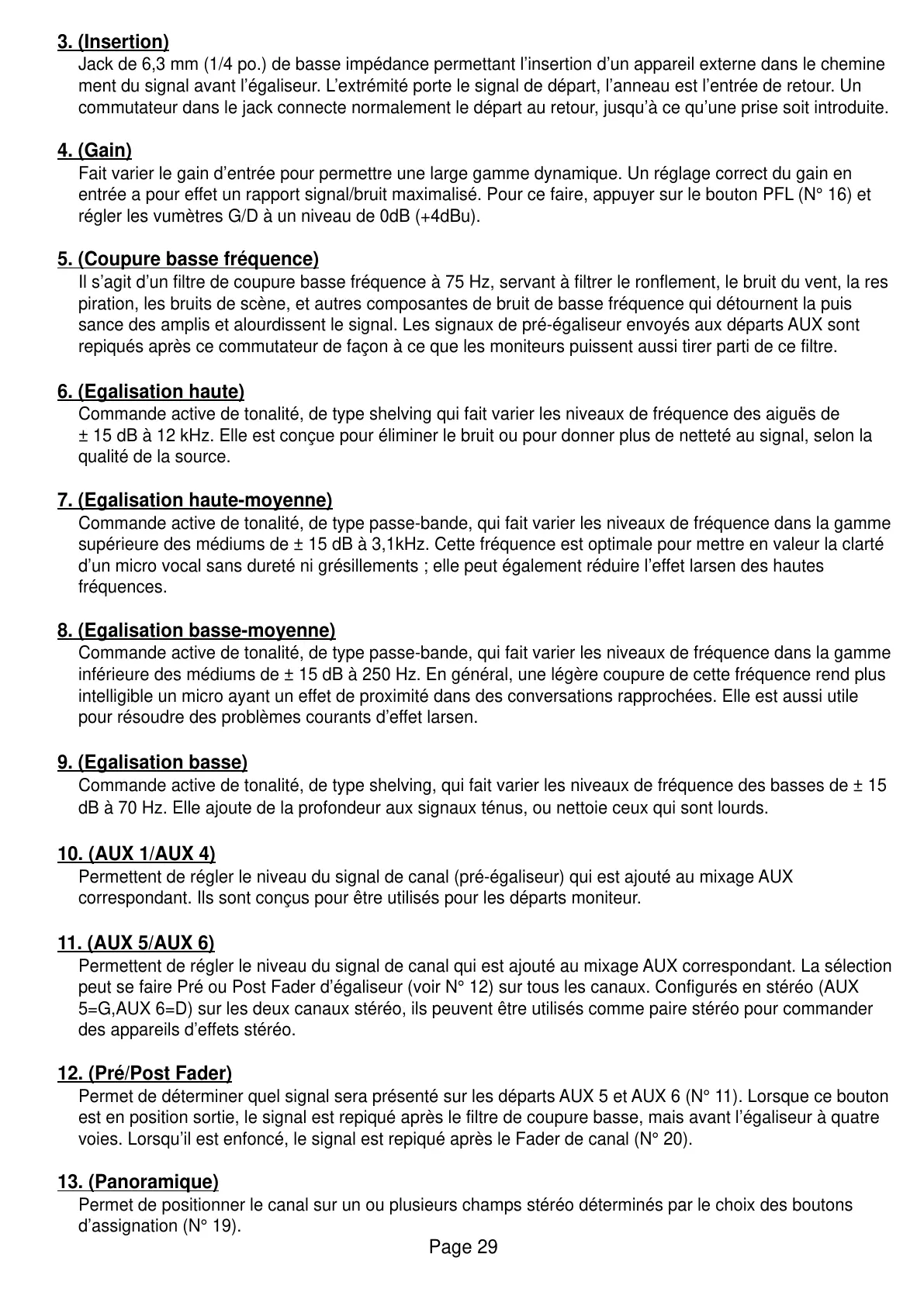 peut se faire Pré ou Post Fader d’égaliseur (voir N° 12) sur tous les canaux. Configurés en stéréo (AUX
