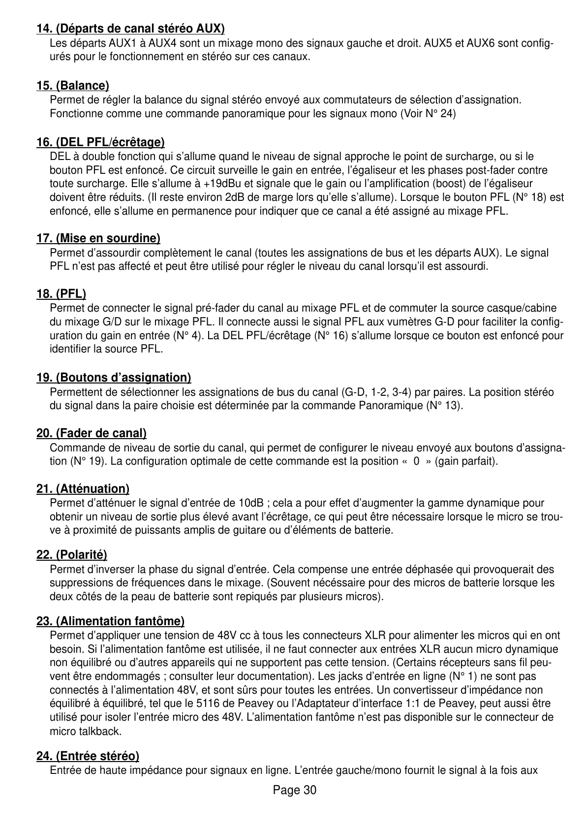 uration du gain en entrée (N° 4). La DEL PFL/écrêtage (N° 16) s’allume lorsque ce bouton est enfoncé pour