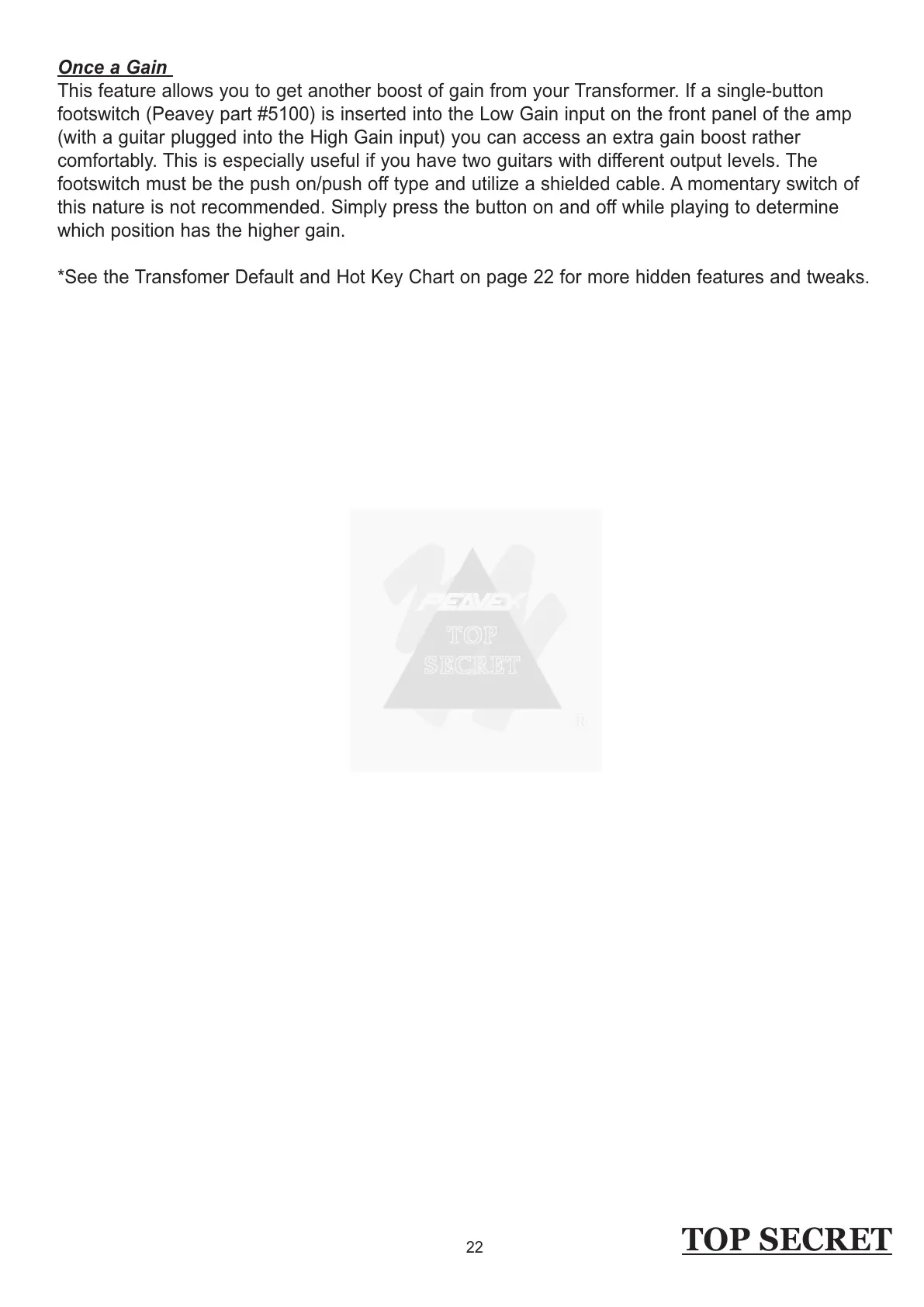 footswitch (Peavey part #5100) is inserted into the Low Gain input on the front panel of the amp