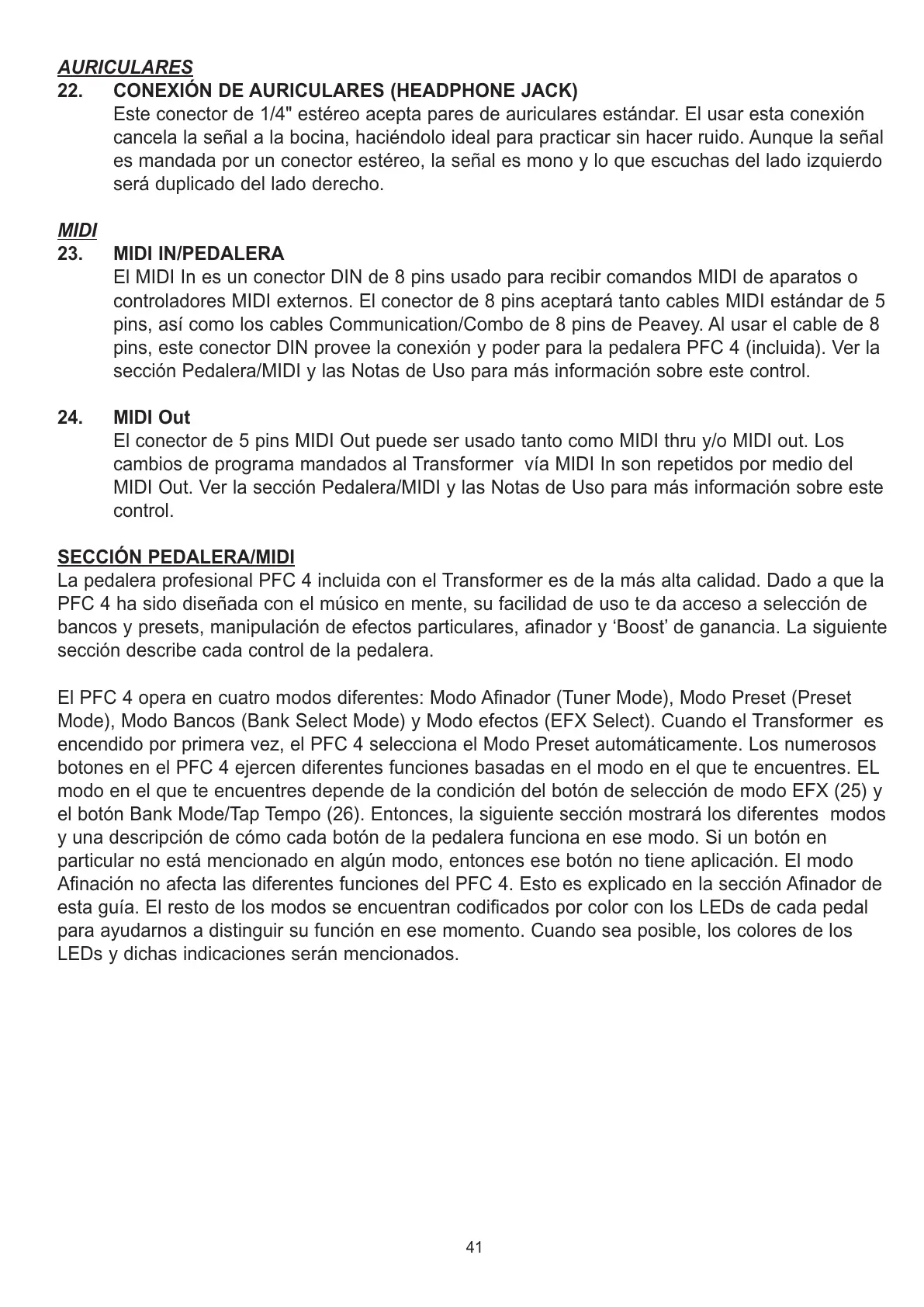 pins, este conector DIN provee la conexión y poder para la pedalera PFC 4 (incluida). Ver la