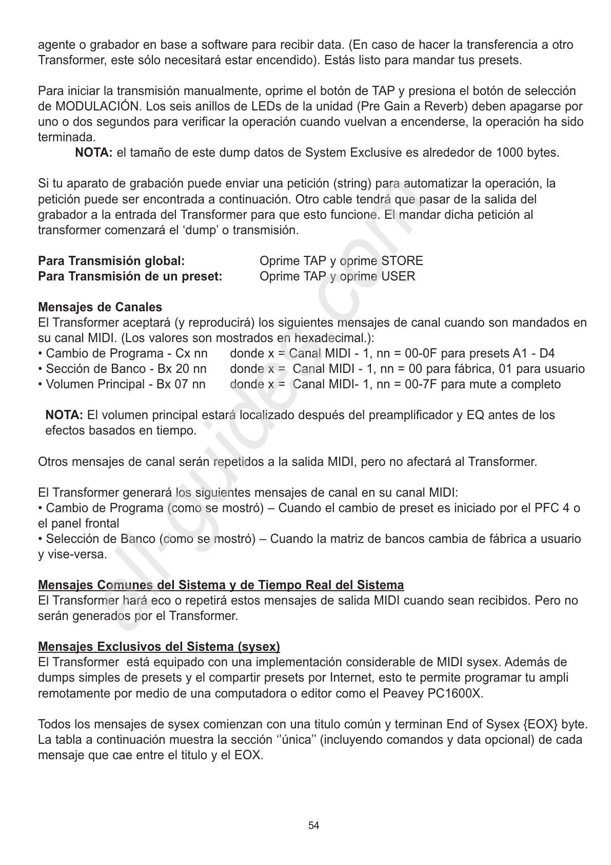 Otros mensajes de canal serán repetidos a la salida MIDI, pero no afectará al Transformer.
