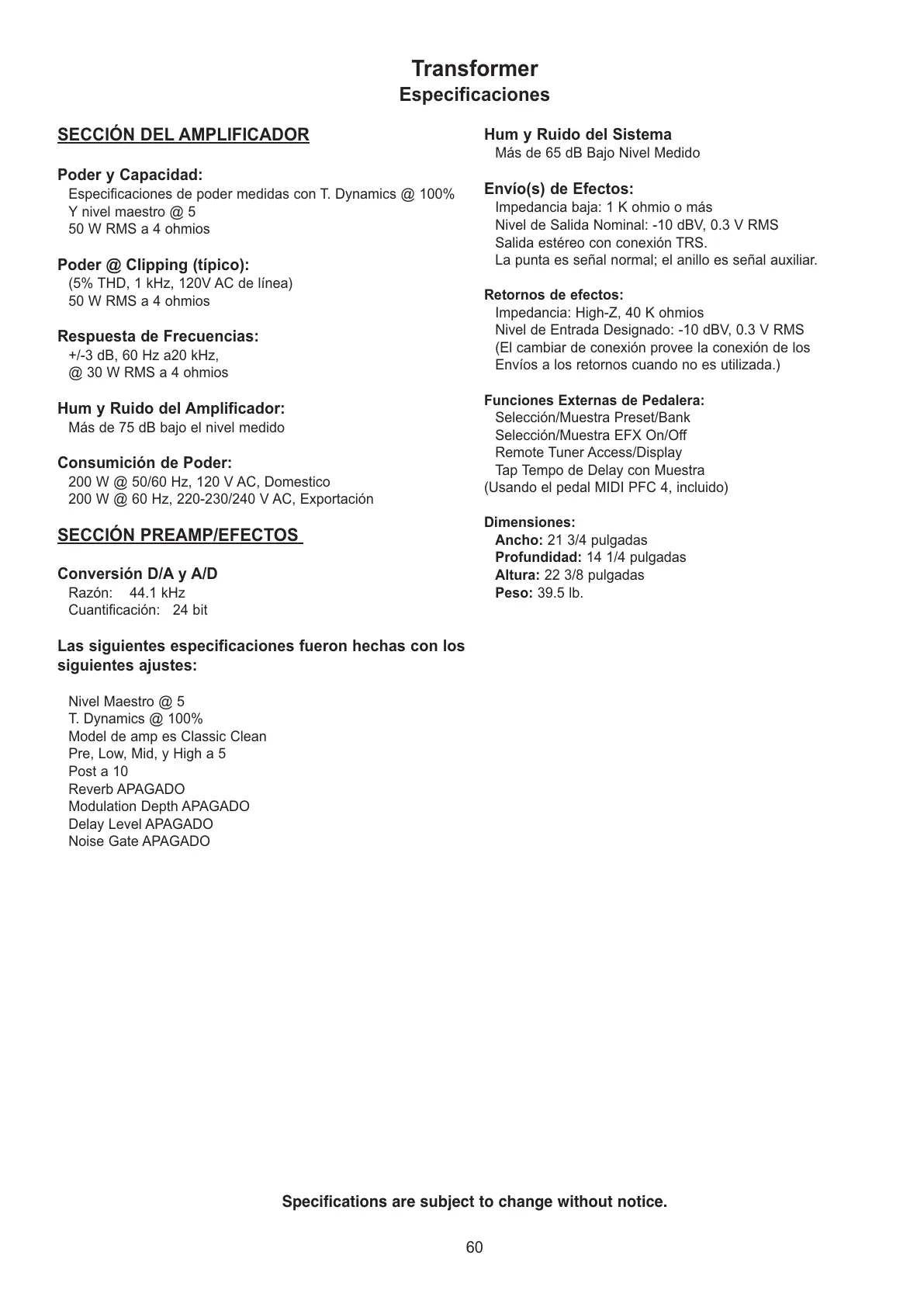 Especificaciones de poder medidas con T. Dynamics @ 100%