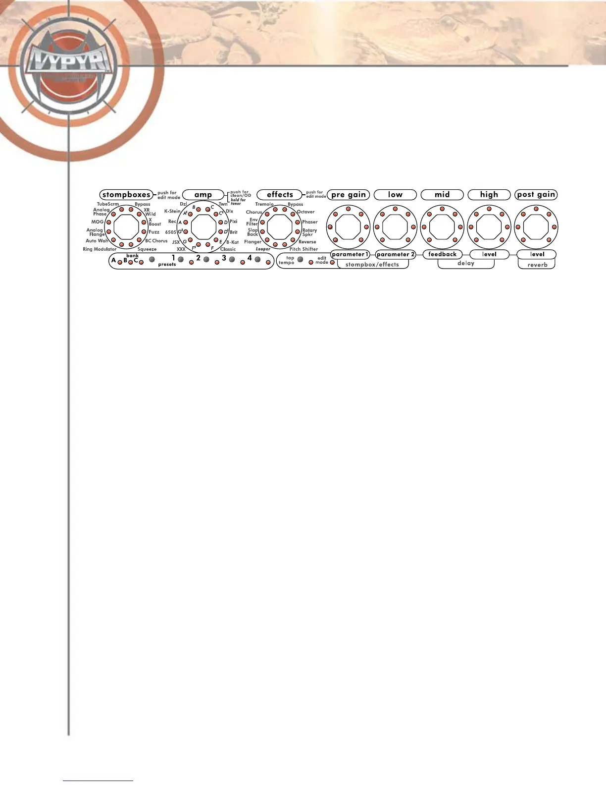 Regler für Stompbox-Auswahl, Amplifier-Auswahl und Effect-Auswahl. Beim Betätigen eines jeden