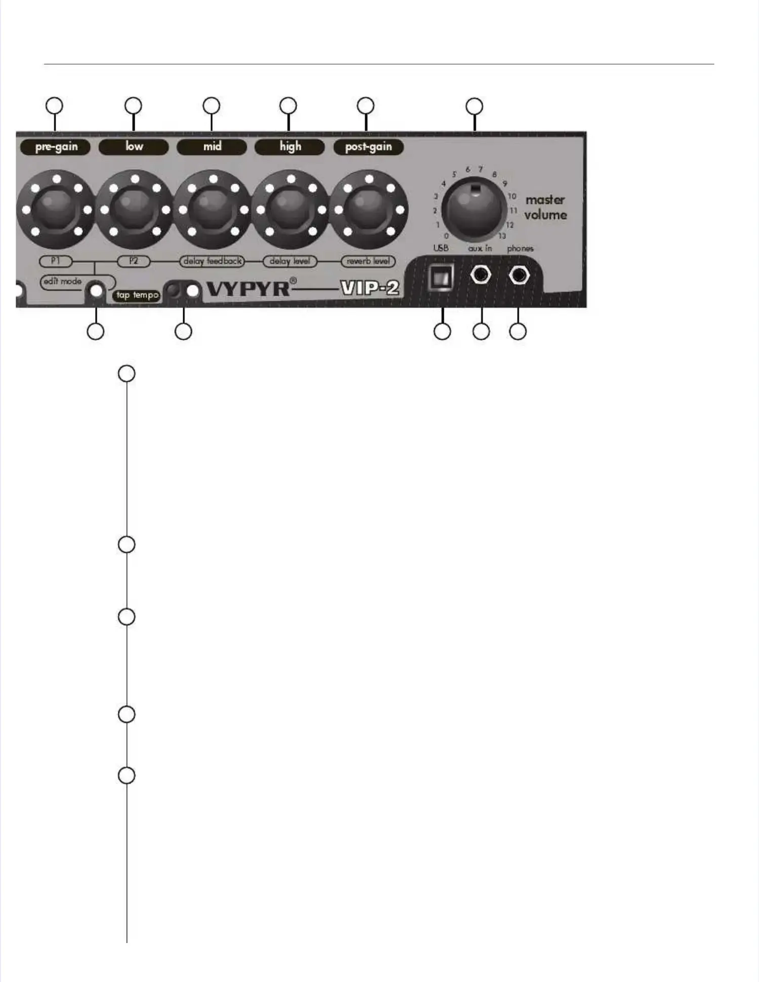 Mid EQ adjustment. Mid EQ adjustment. In edit mode this In edit mode this knob controls the Fknob controls the Feedback of the Delay effect. eedback of the Delay effect. Feedback is theFeedback is the