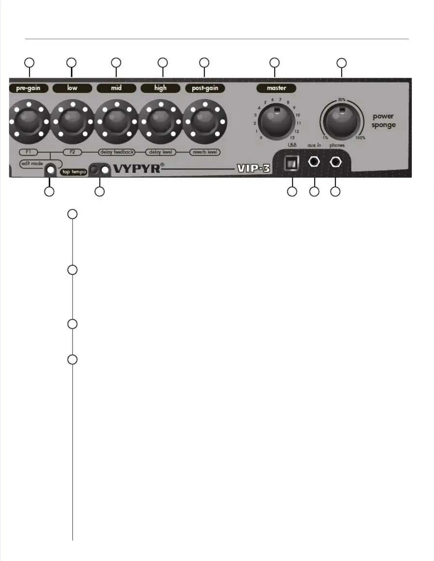Mid EQ adjustment. Mid EQ adjustment. In edit mode this In edit mode this knob controls the Fknob controls the Feedback of the Delay effect. eedback of the Delay effect. Feedback is theFeedback is the