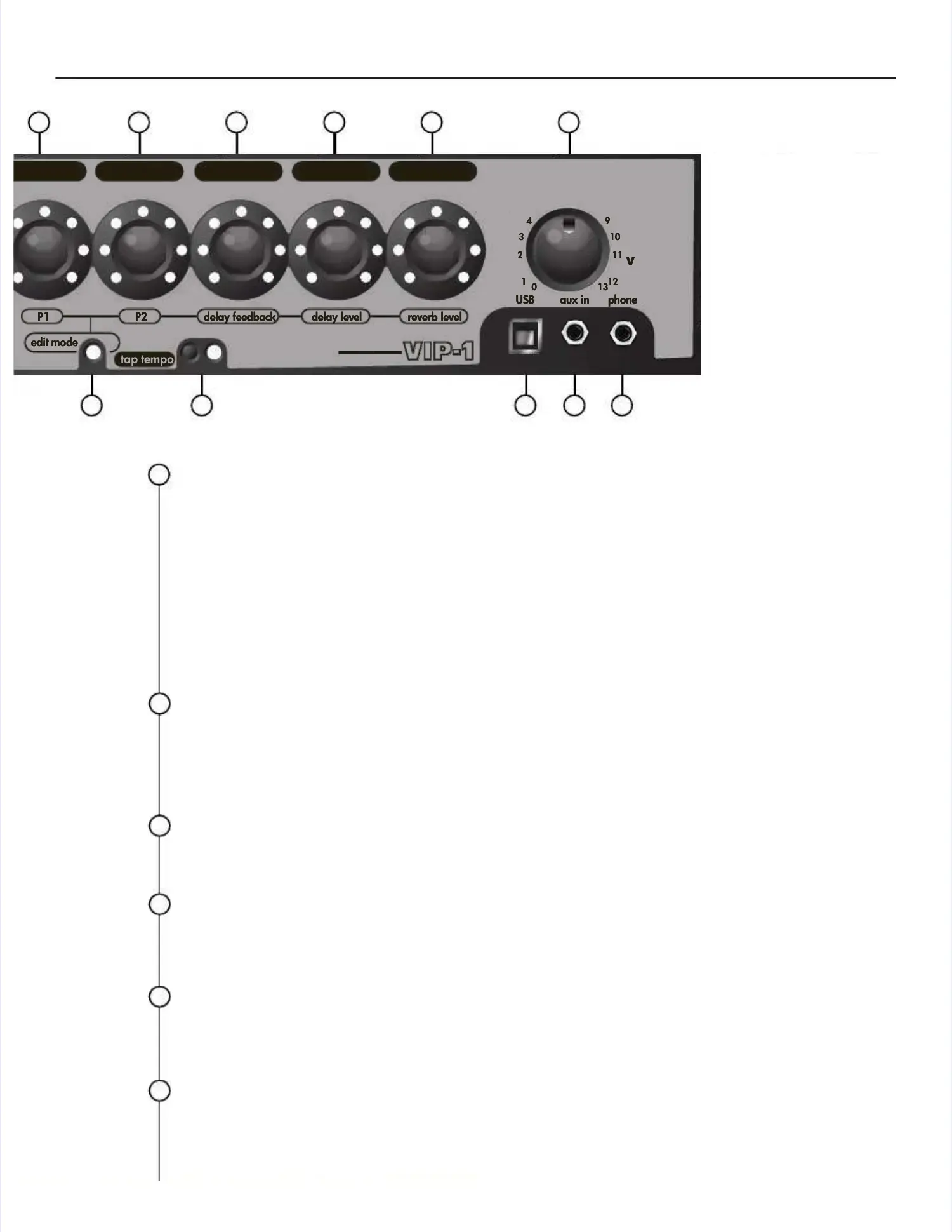 Mid EQ adjustment. Mid EQ adjustment. In edit mode this In edit mode this knob controls the Fknob controls the Feedback of the Delay effect. eedback of the Delay effect. Feedback is theFeedback is the