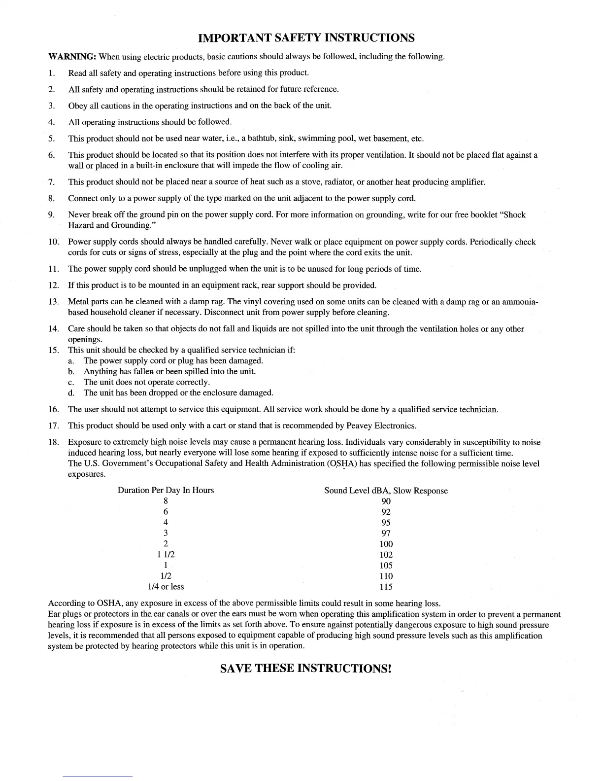 Peavey XR 600E - Important Safety Instructions; General Electrical and Operating Safety; Noise Exposure and Hearing Protection