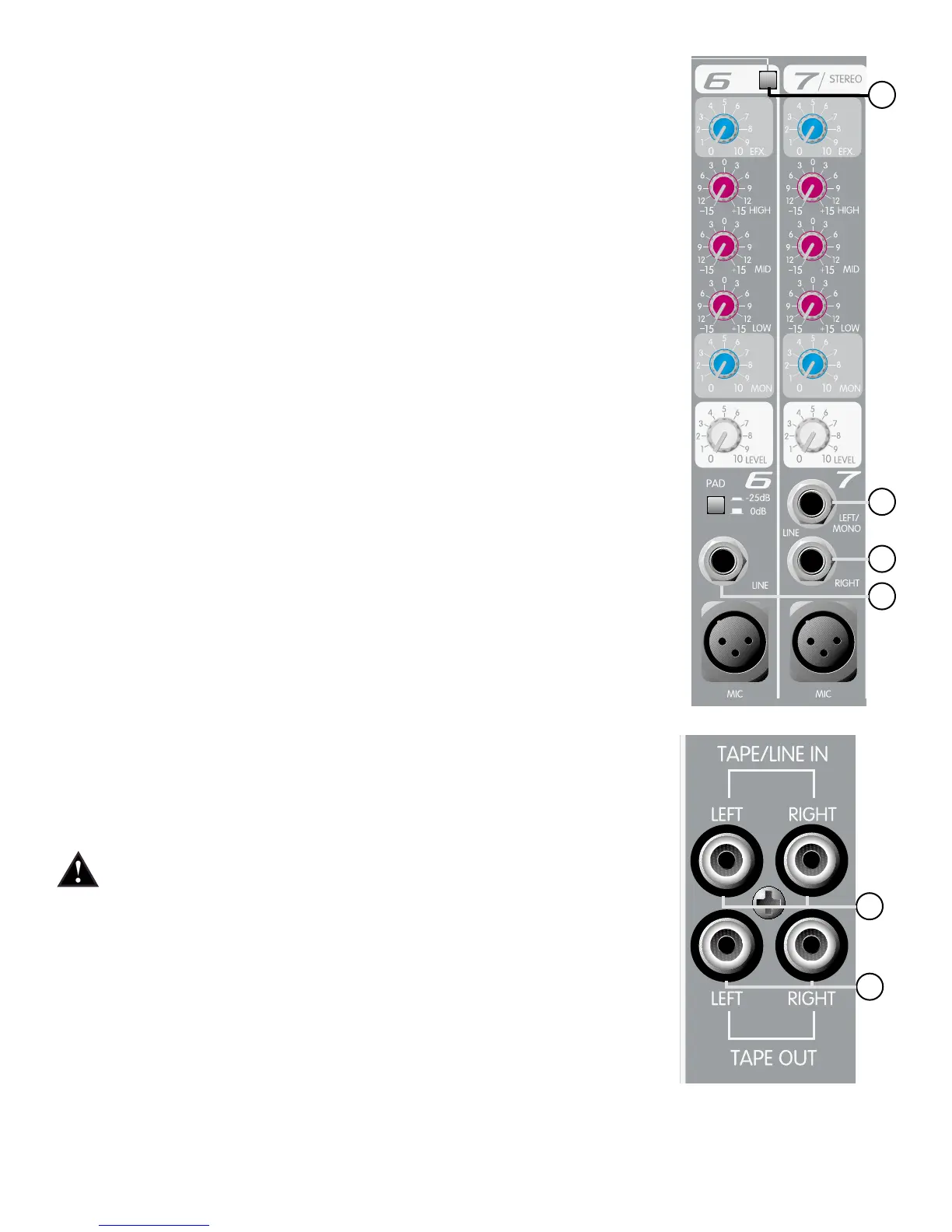 16. EFFECTS PEAK LED: Illuminates to indicate -6 dB of headroom before the
