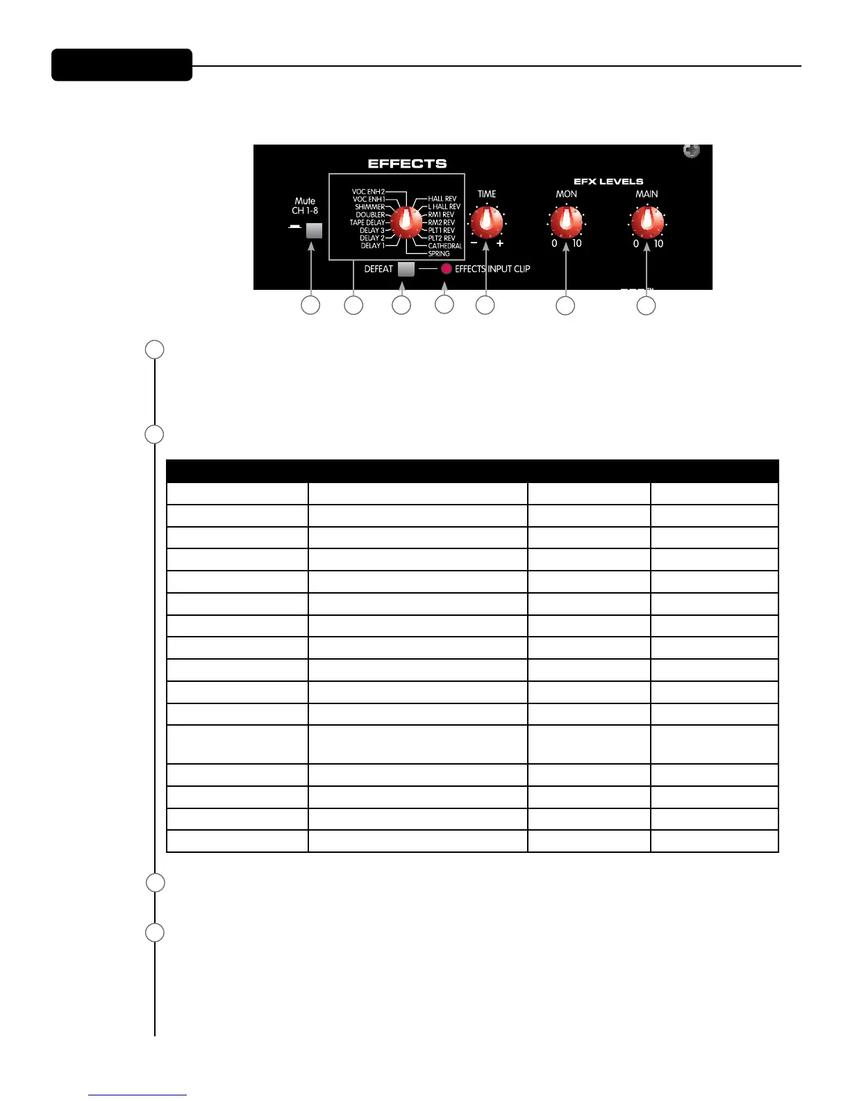 Este interruptor giratorio selecciona uno de los dieciséis efectos disponibles. Consulte la tabla siguiente.