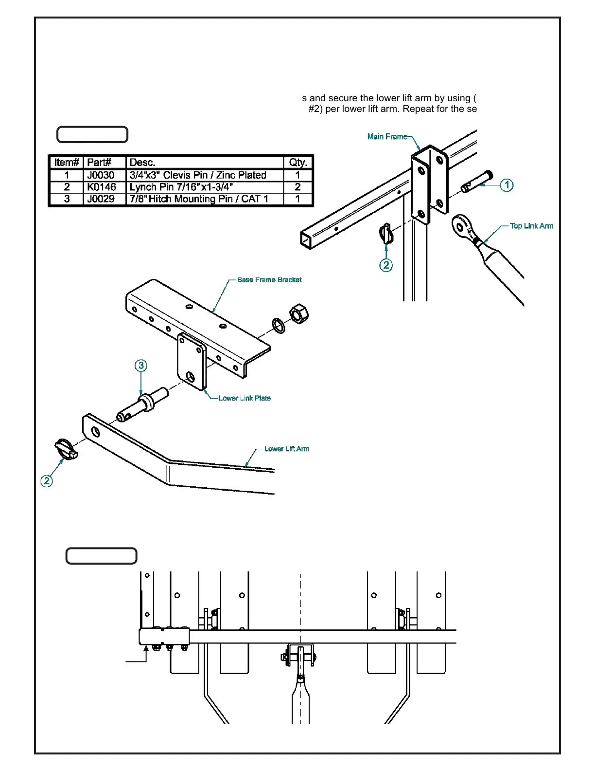 Mounting Pin (Item #3) and (1) 7/16” x 1-3/4” Lynch Pin (Item #2) per lower lift arm. Repeat for the second lower lift