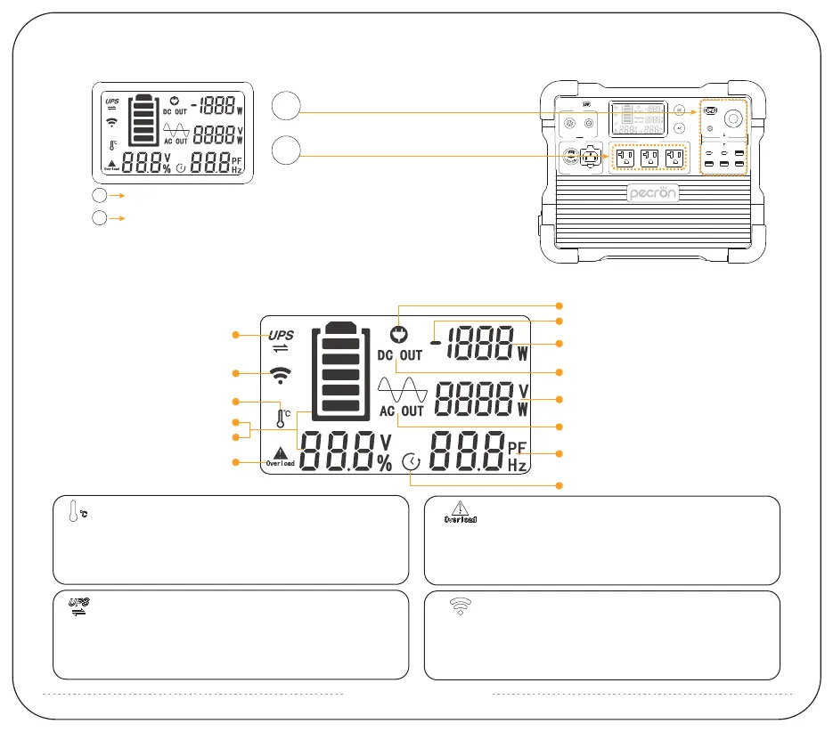 機器が2200Wを超えると、ACオーバーロードインジケーターアイコンが点滅し