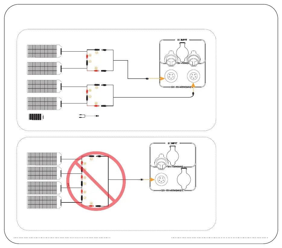 Pecron E2000 LFP - SOLAR PANEL CONNECTION EXAMPLES; 800 W (4 x200 W) Series Connection; Warning: Four Panel Series Limit