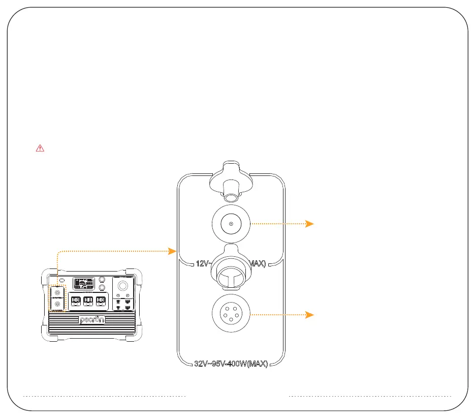 2. GX16MF-5 Charging Port: PV(operating voltage) range 32V~95V, 400W maximum; VOC(open circuit voltage) of solar