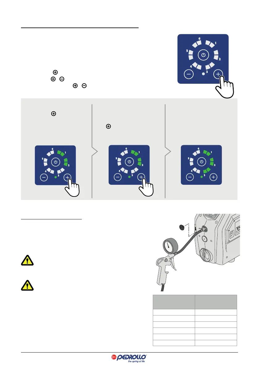 La PRESSIONE DI LAVORO viene visualizzata attraverso i LED di colore verde che si