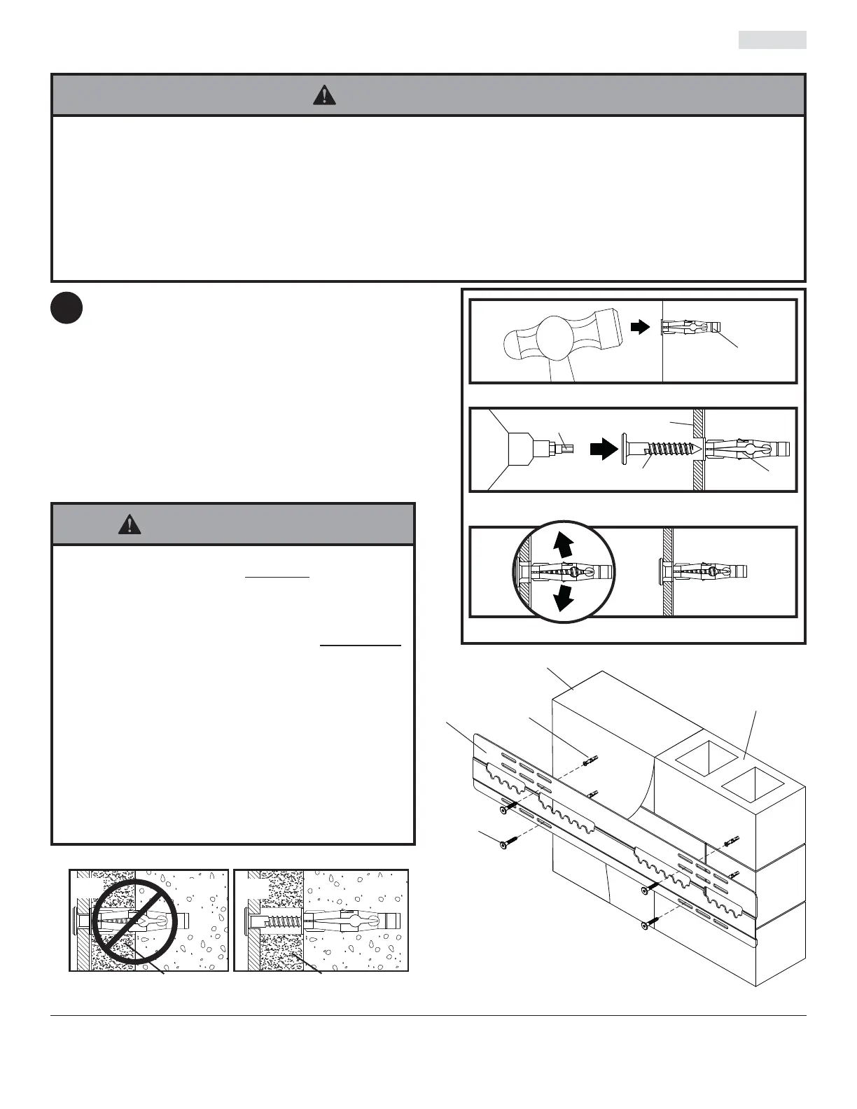 • Nunca fi je los anclajes de expansión a una pared de concreto o bloques de hormigón de escorias recubiertos con yeso, a yeso-cartón u otro