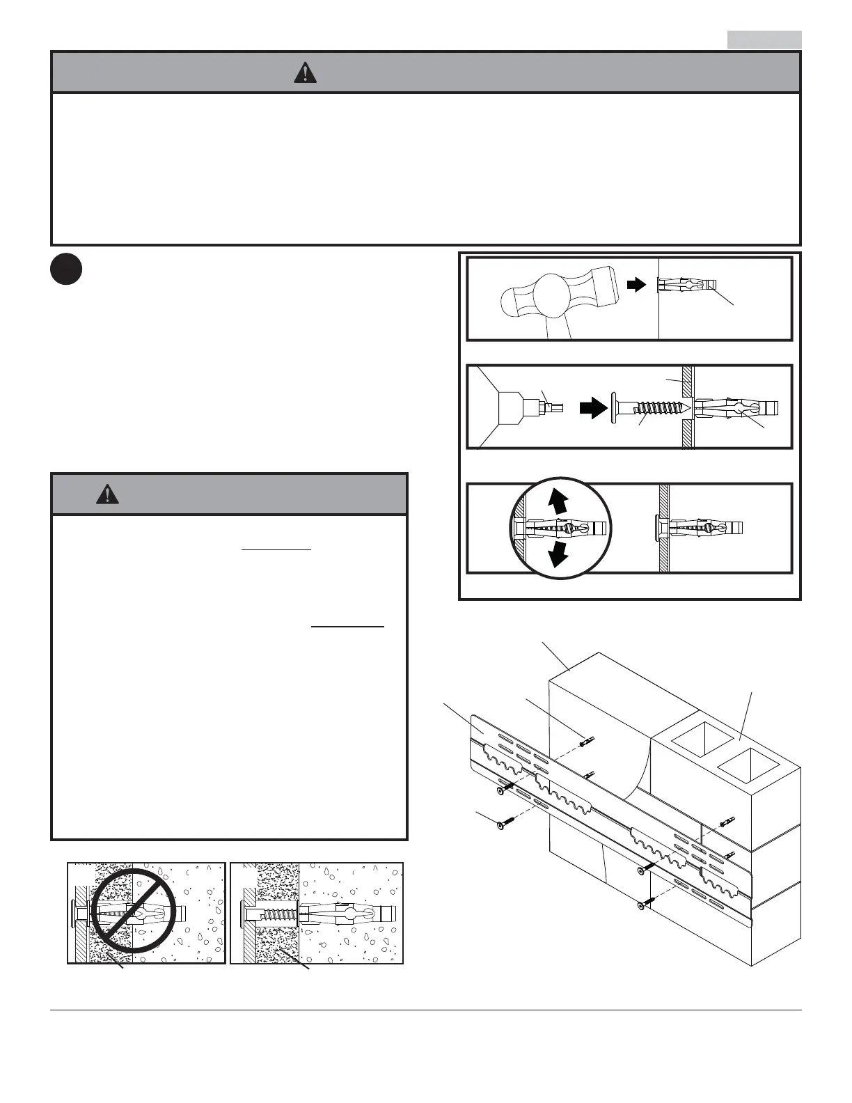 • Ne fi xez jamais des chevilles à expansion à du béton ou du bloc de béton recouvert d’une couche de plâtre, d’une cloison sèche ou de tout autre