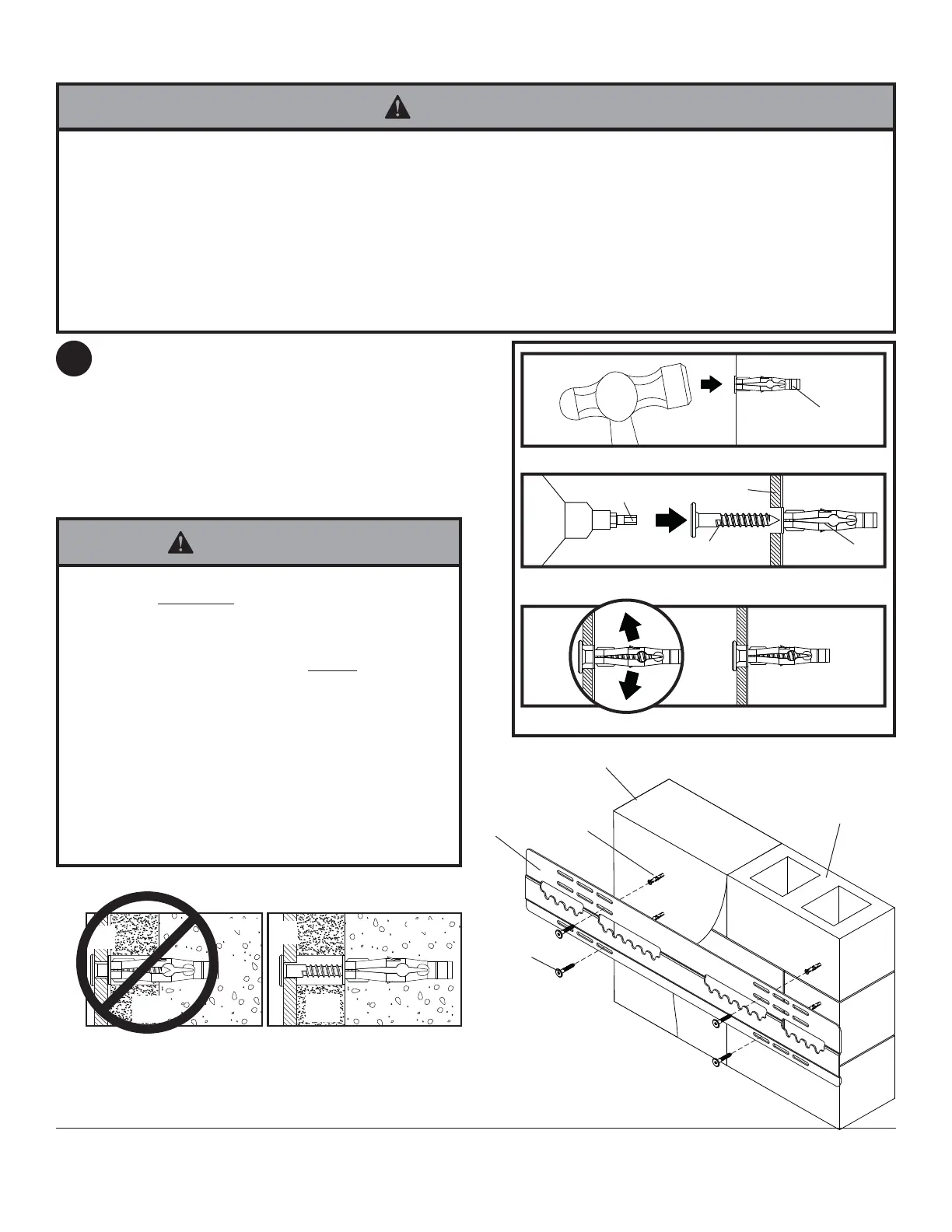 • Never attach expansion anchors to concrete or cinder block covered with plaster, drywall or other fi nishing material.