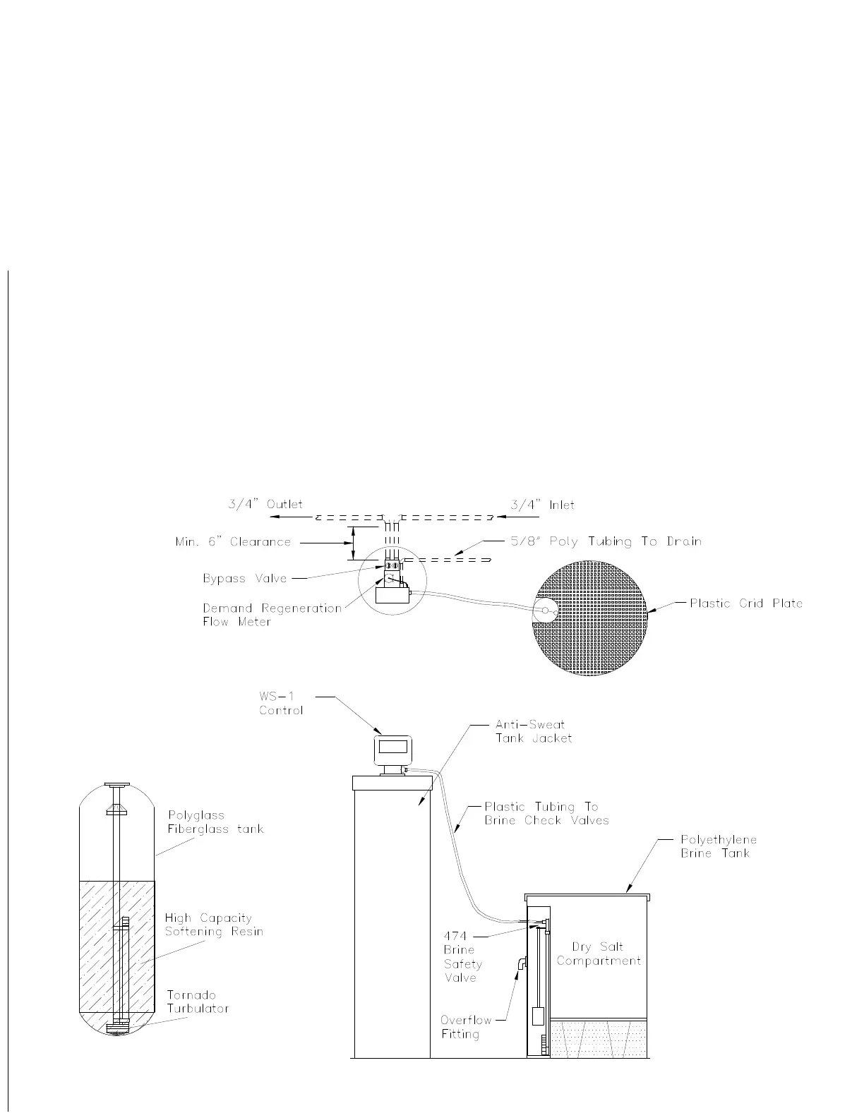 installed below the bottom of the unit. The drain and brine lines should NOT be installed with tubing that can