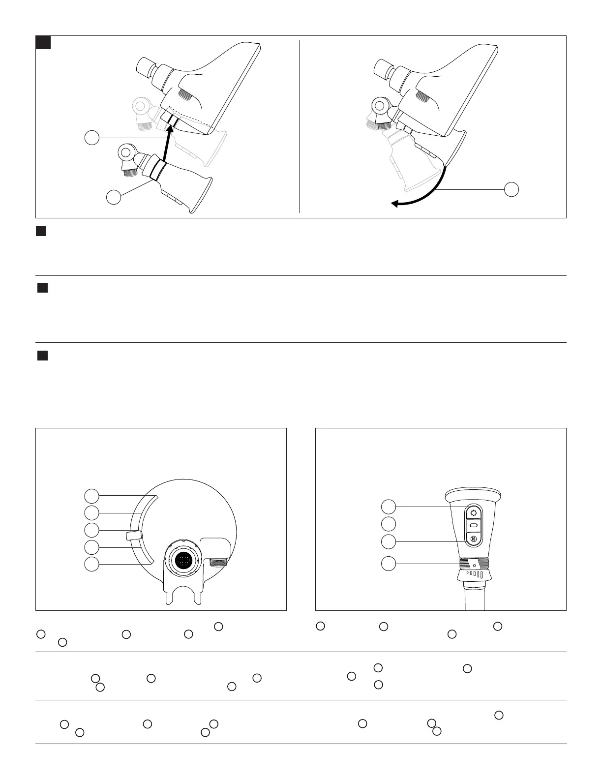 (1) To attach the hand shower to the shower head, make sure that the hand shower controls are facing down and water flow adjustments (2) align with the