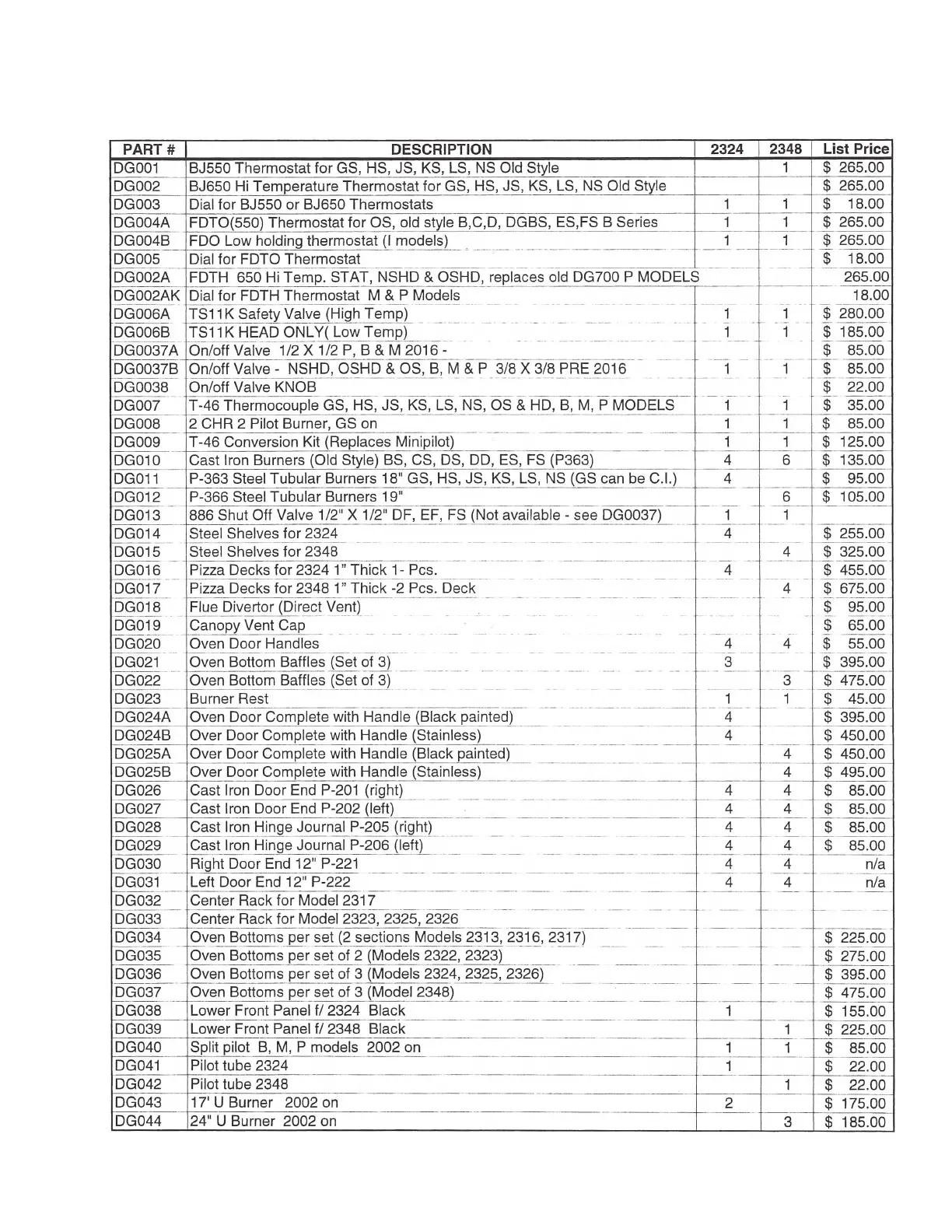 2324 AND 2348 B, M AND P PARTS LIST