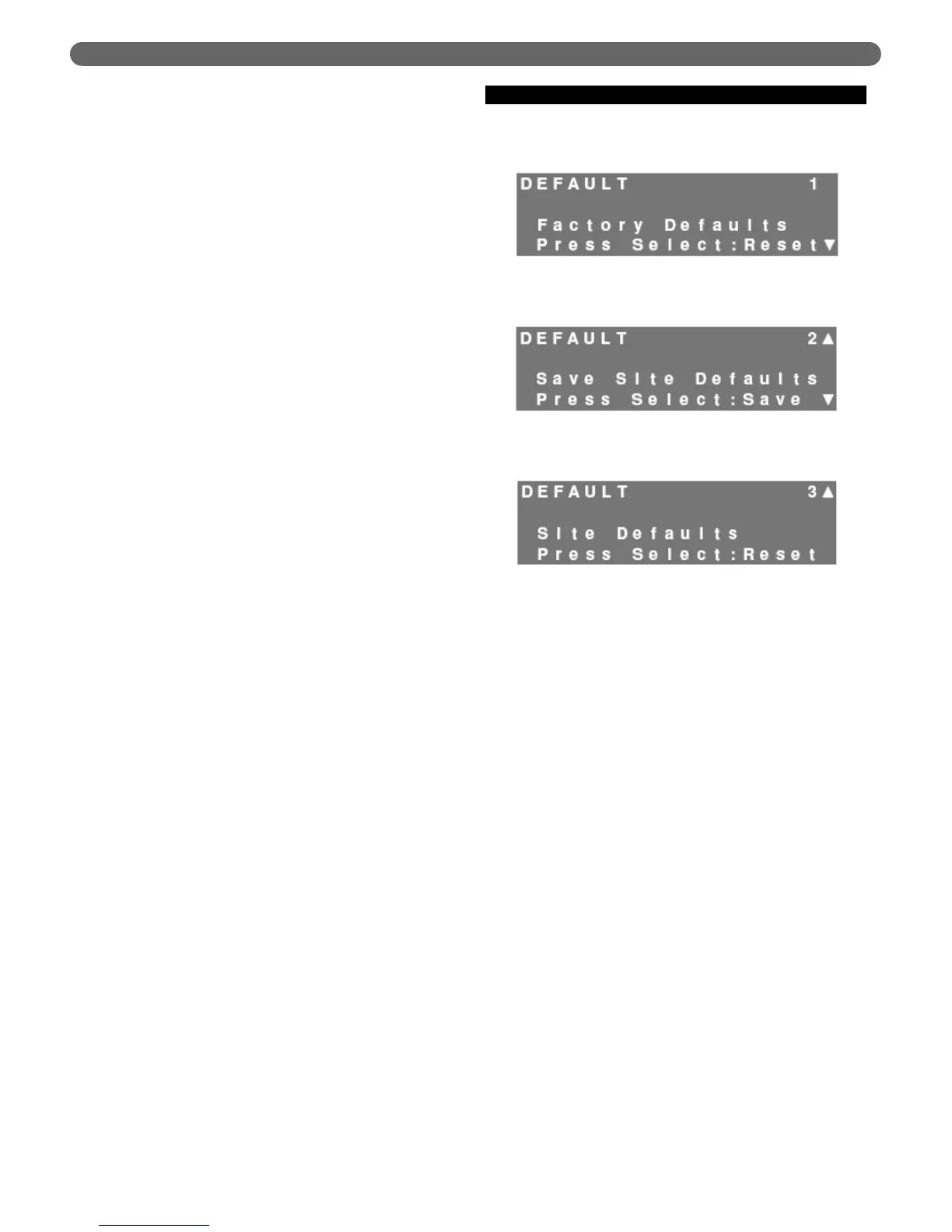 “Site Defaults,” press the “Select” key while in the