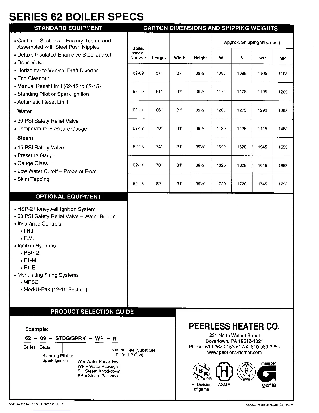 SERIES 62 BOILER SPECS