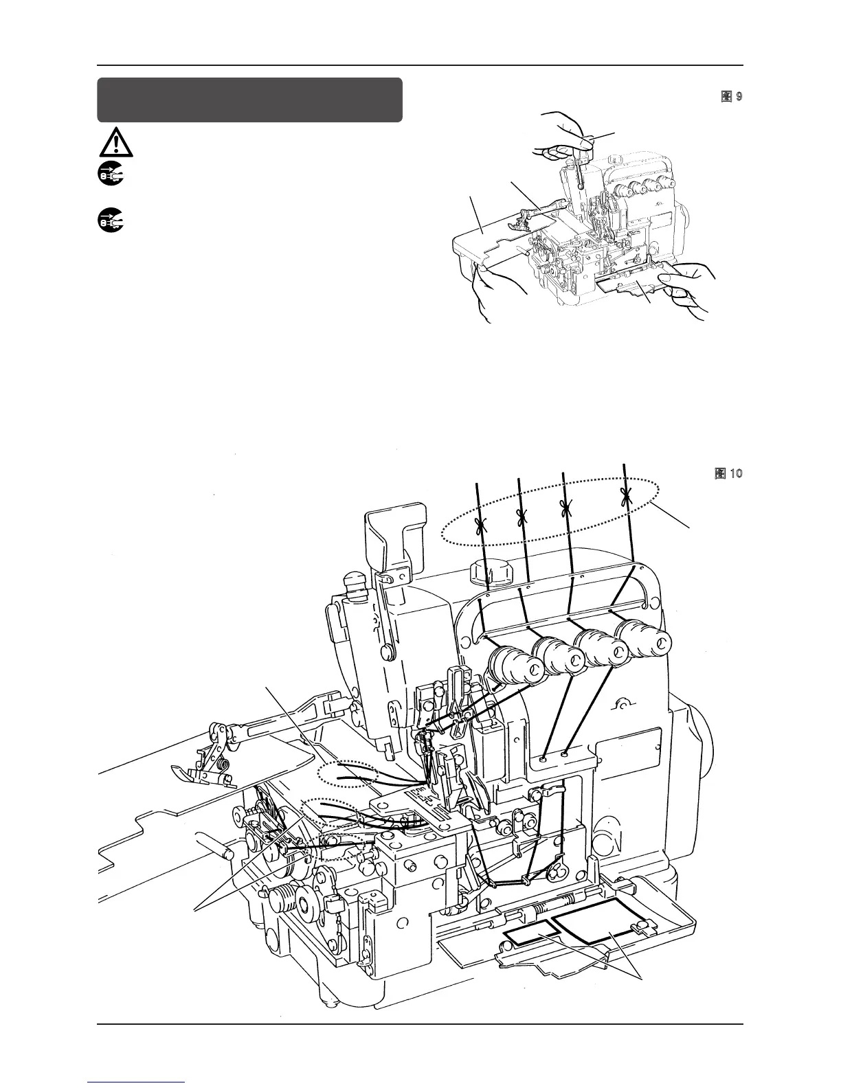 在进行穿线时,务必将缝纫机的电源关掉,将插头从电