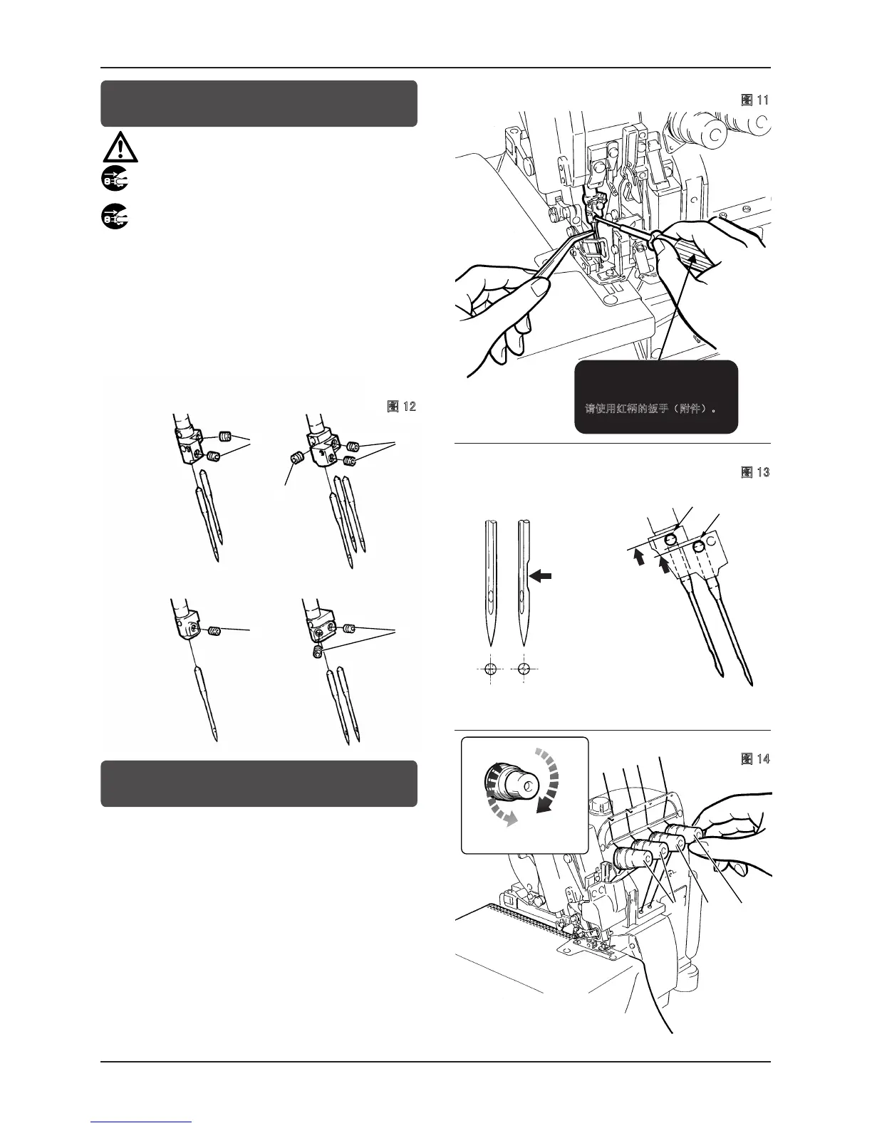 在更换机针时,务必将缝纫机的电源关掉,将插头从电