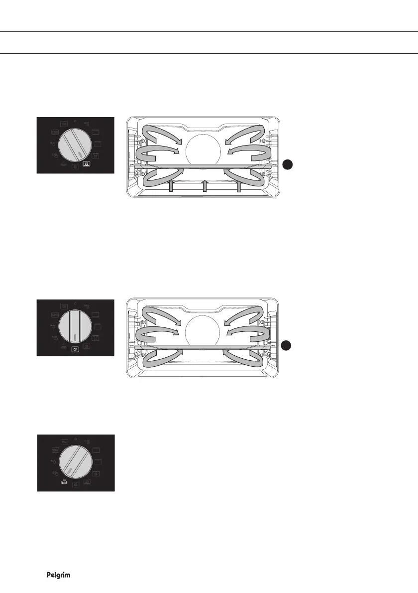 Food is heated by hot air from the fan and heating element, which are