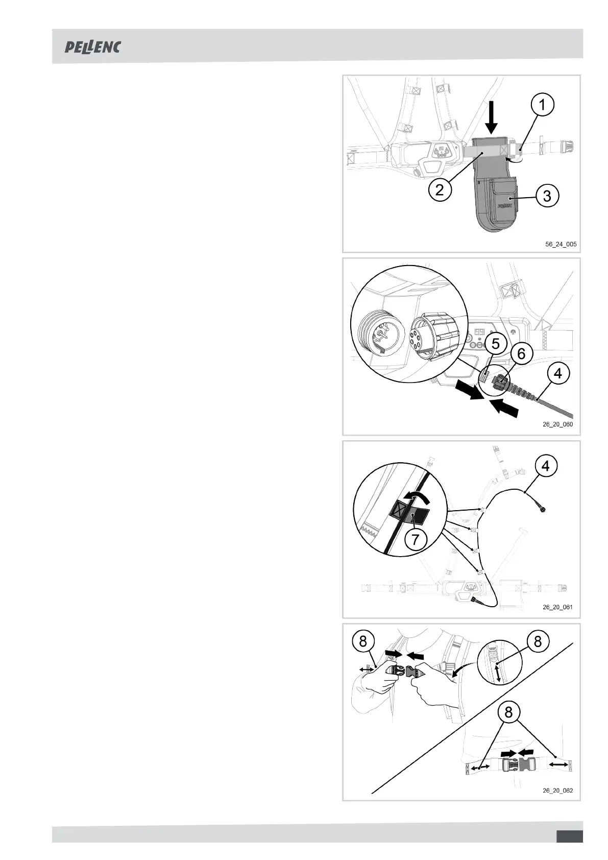 11. Put on the harness and adjust with the straps (8).