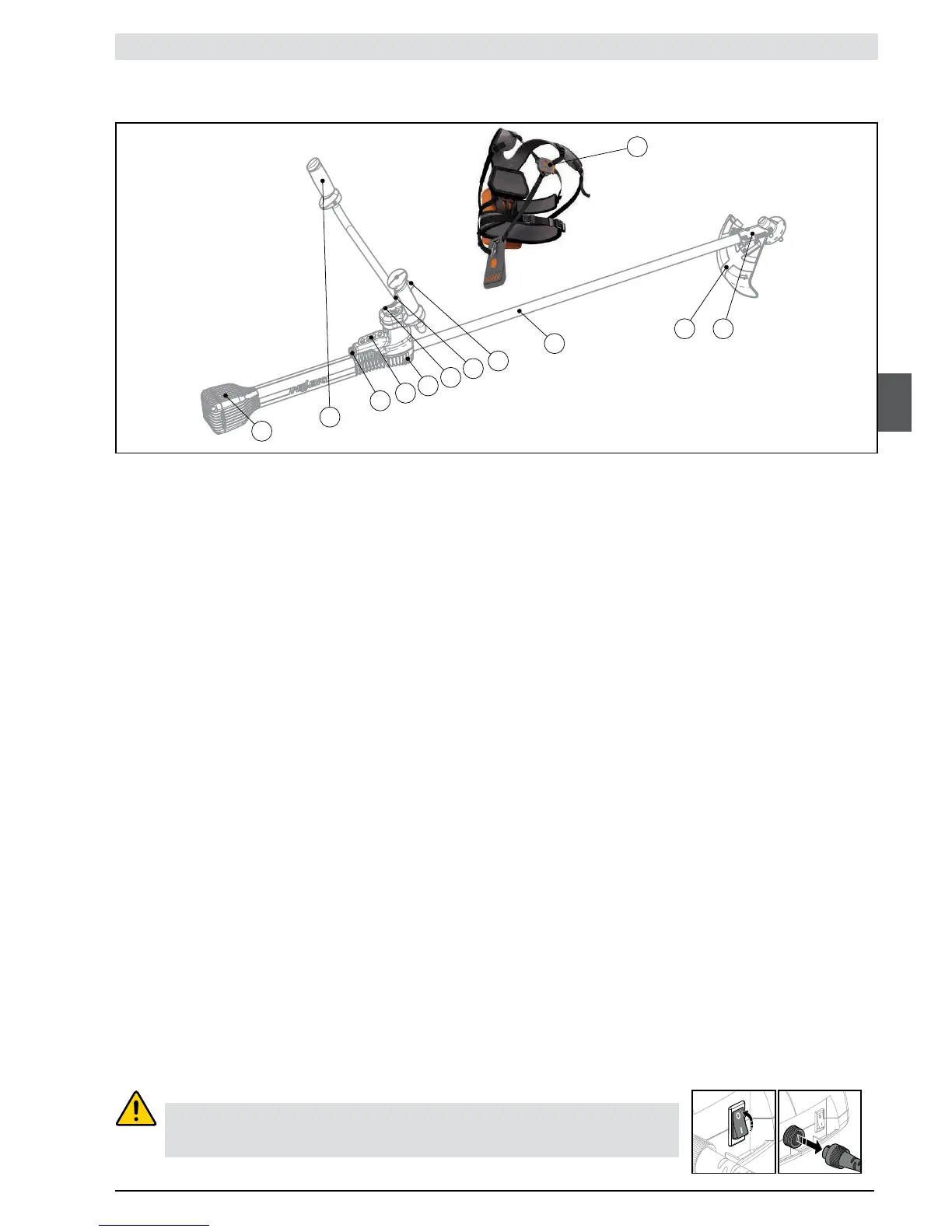 10– Safety guard: Limits the risk of the operator being hit by ying objects (stones, bits of metal). A blade attached to the safety