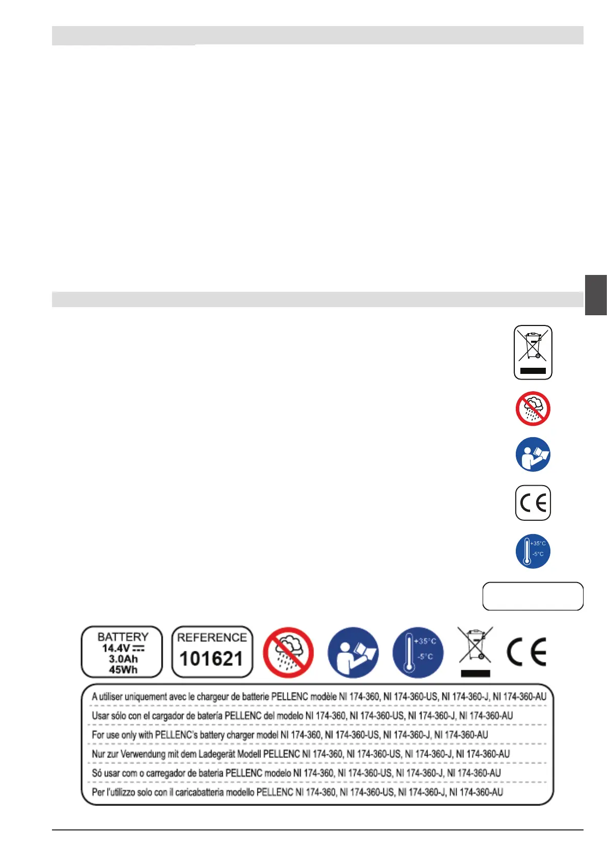 16– Do not use the battery for any other application than the one it was designed for (exclusive use for Pellenc