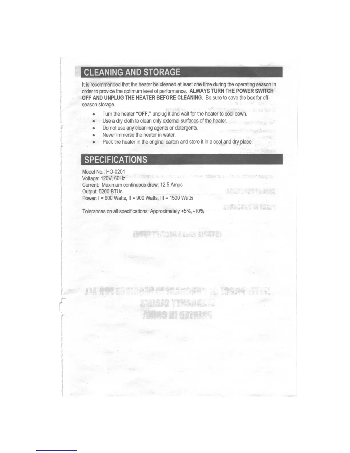Pelonis HO-0201 - Cleaning and Storage; Cleaning Procedures; Storage Guidelines; Specifications