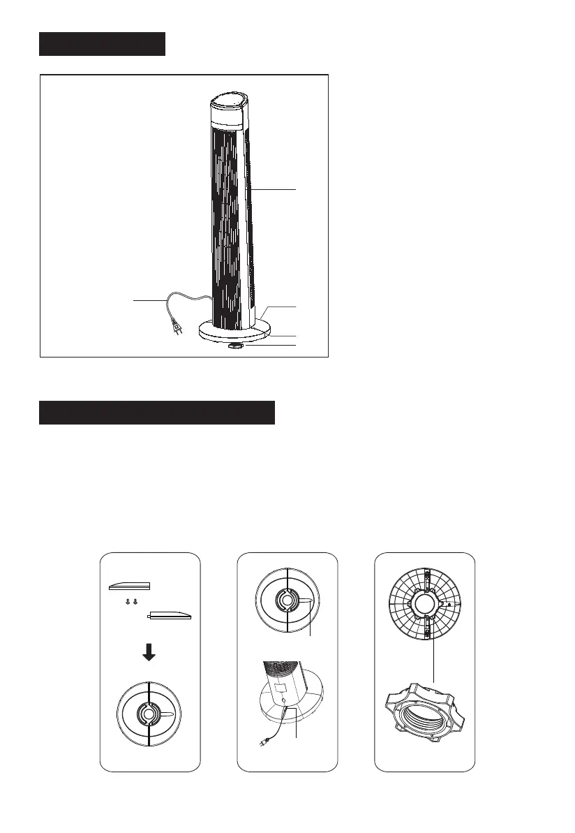 1. Take out the fan body and the spare parts from the box. Put the front base