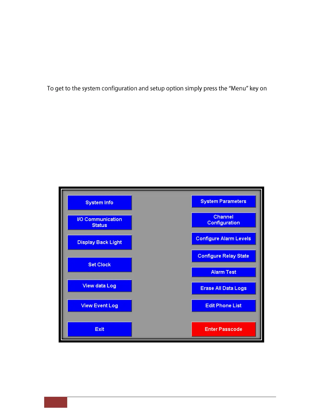 access any of the system configuration options first the user passcode must be