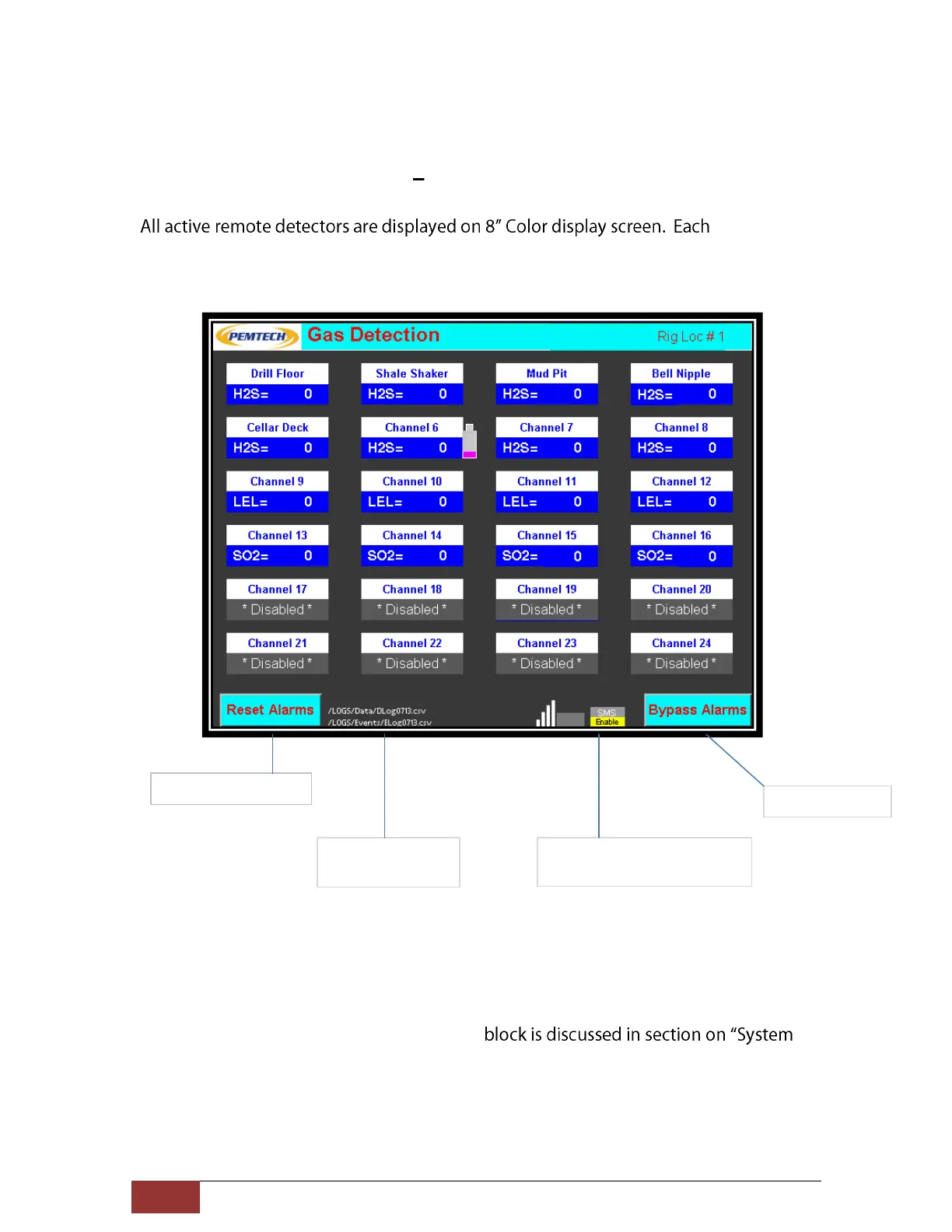indicates the location of the detector, detector type (as H2S,LEL, SO2, etc.) and current