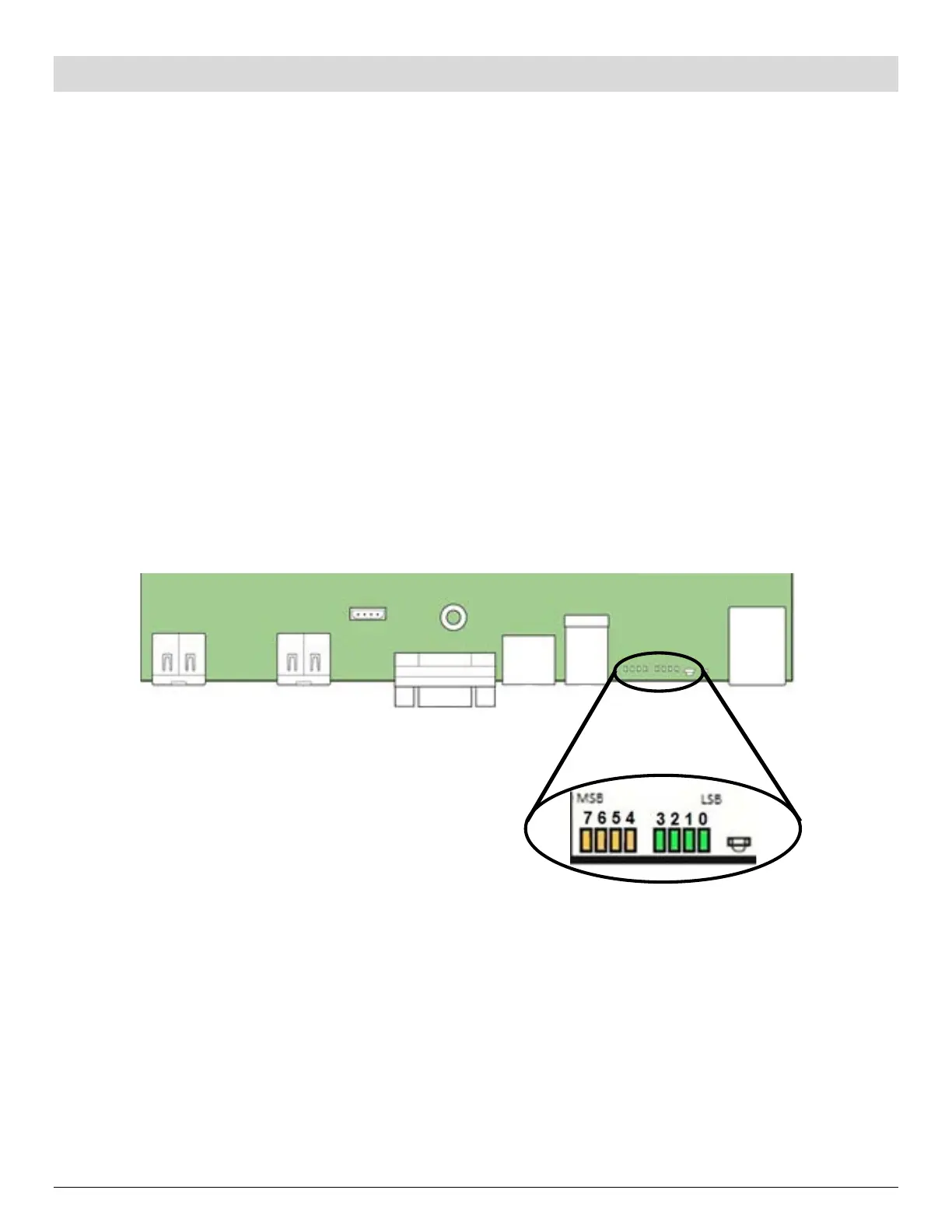 LEDs #4, #5, #6, #7. The lower nibble bits are represented by Green Diagnostics LEDs #0, #1, #2 and #3. If