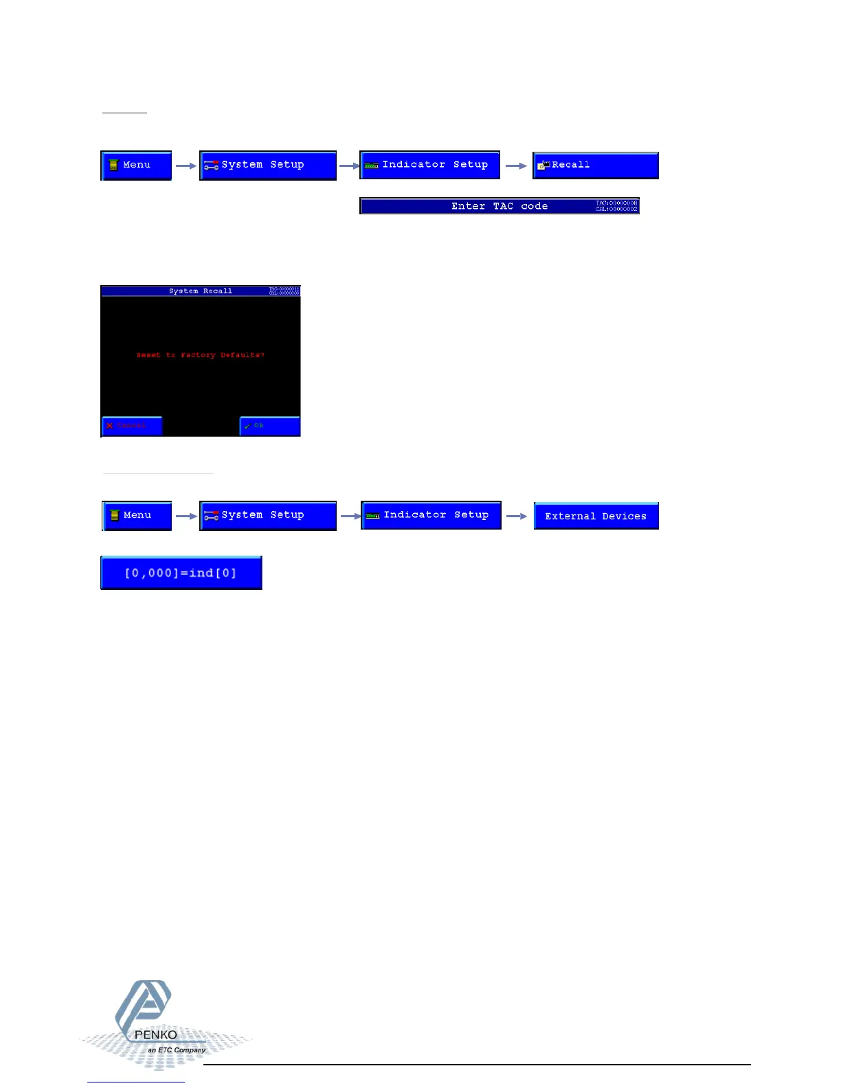 To reset all indicator parameters back to factory settings, select “Recall” from the indicator