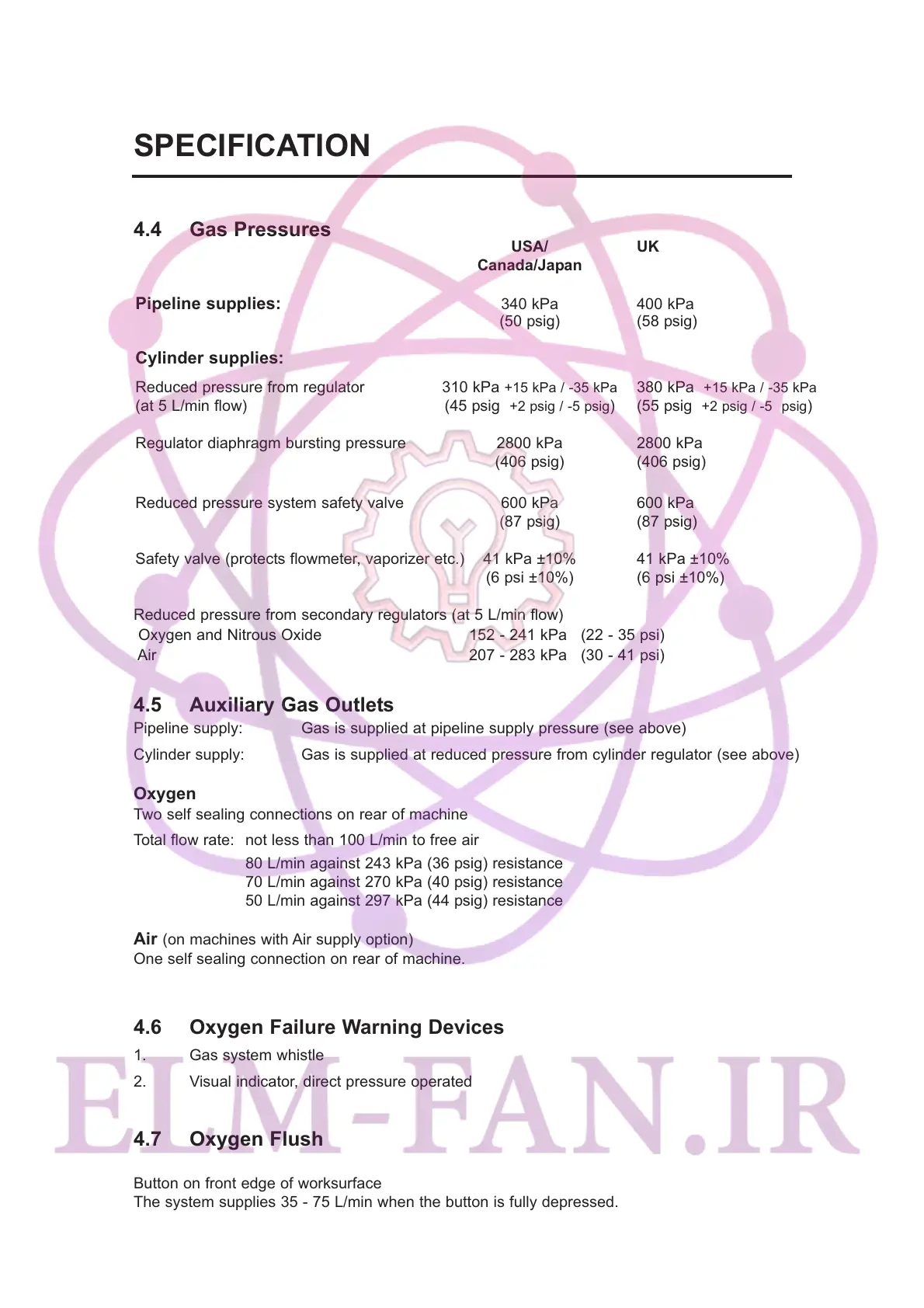 Safety valve (protects flowmeter, vaporizer etc.) 41 kPa ±10% 41 kPa ±10%