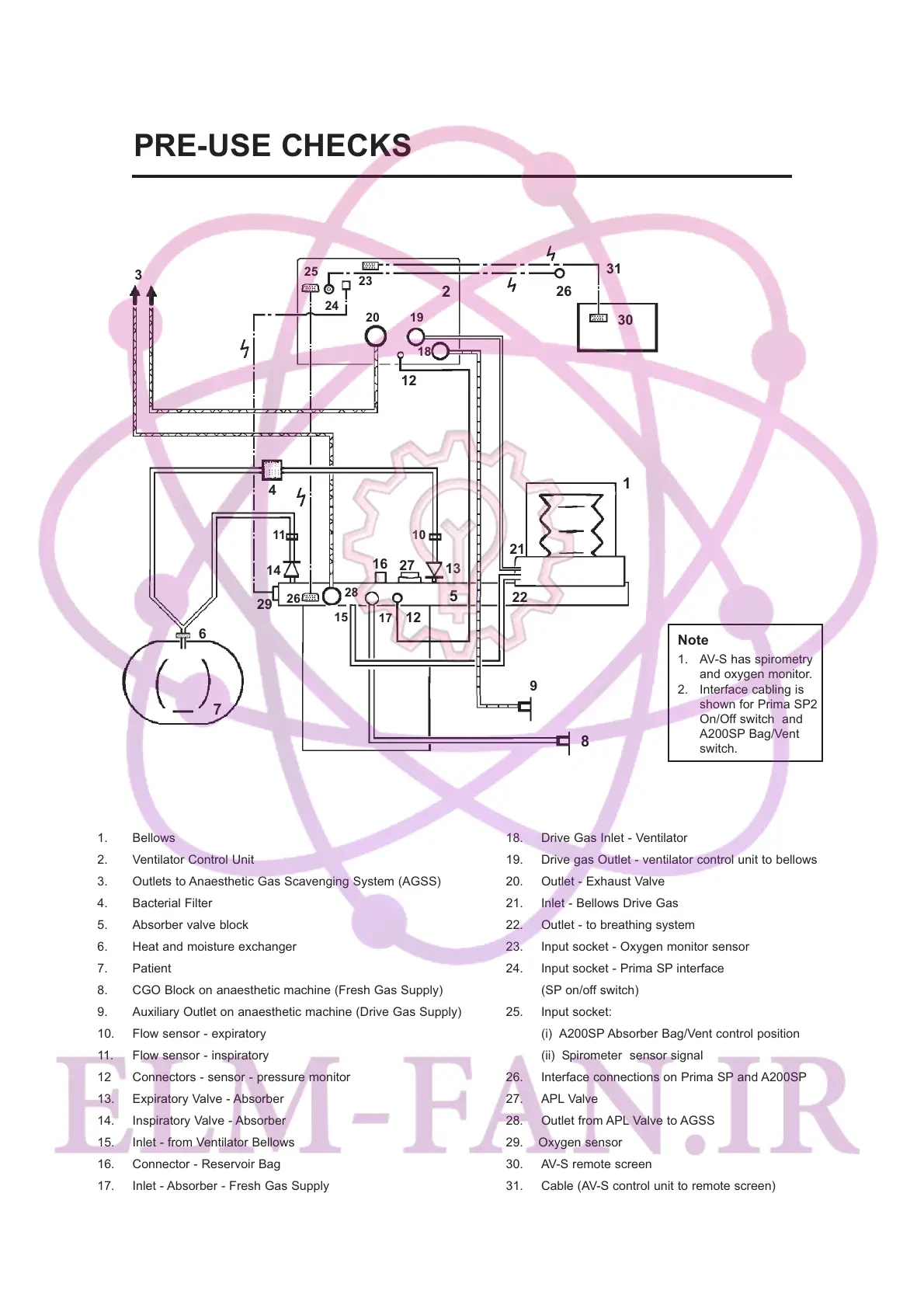 19. Drive gas Outlet - ventilator control unit to bellows