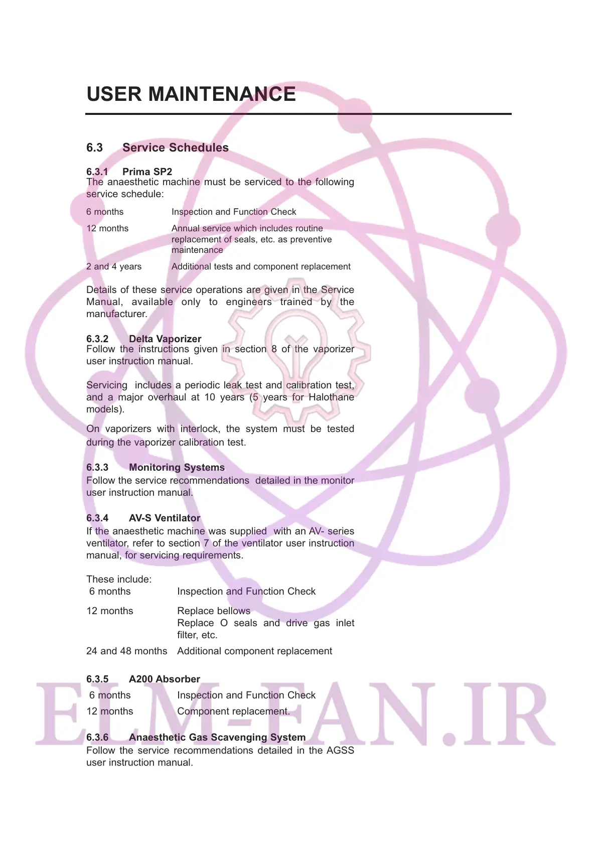 The anaesthetic machine must be serviced to the following