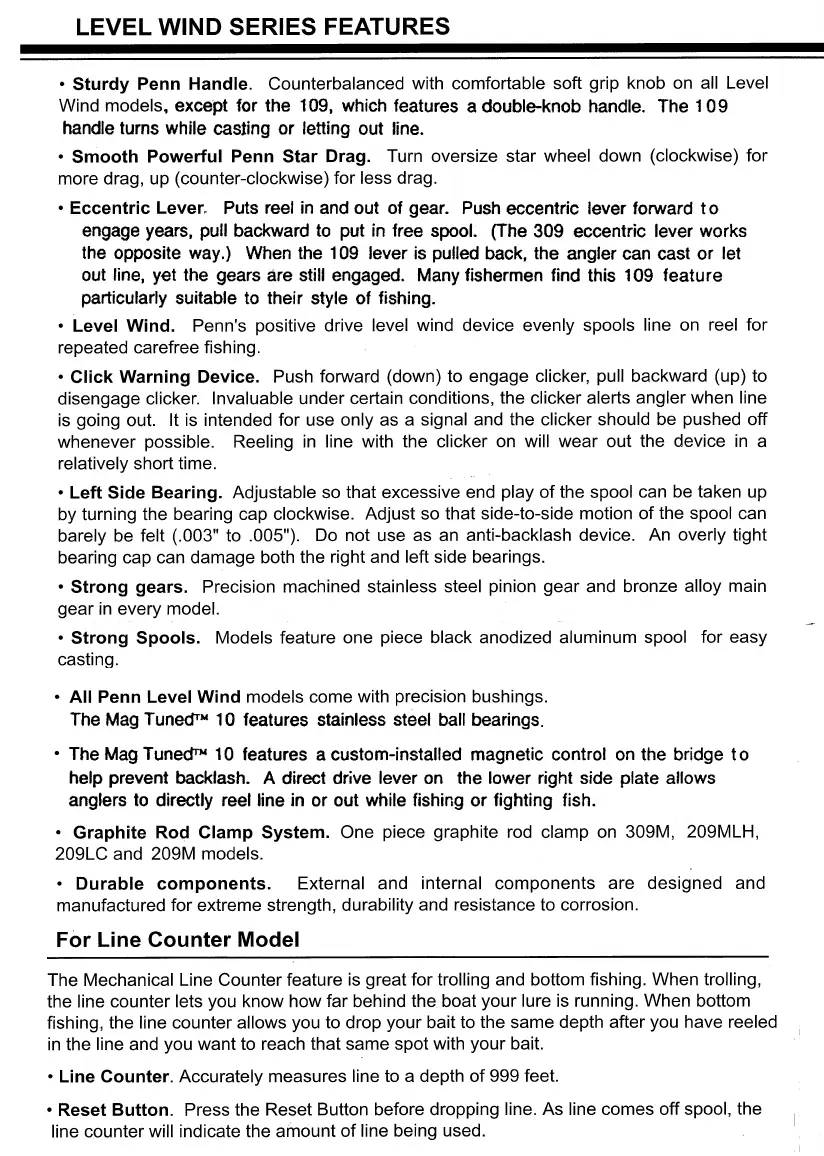 • Level Wind. Penn's positive drive level wind device evenly spools line on reel for