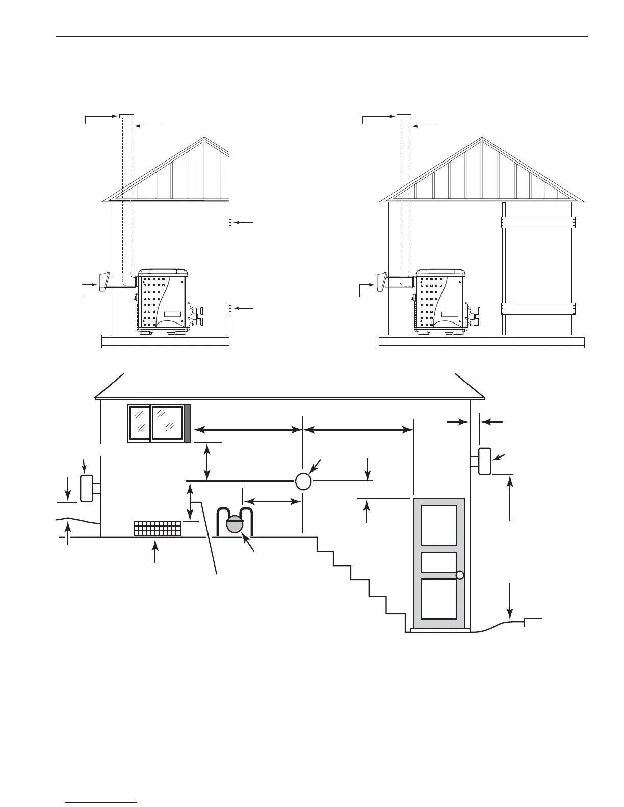 • at least 1.2 M (4 ft) below or horizontally from, or 0.3 M (1 ft) above, any doors or windows or gravity air inlet to a