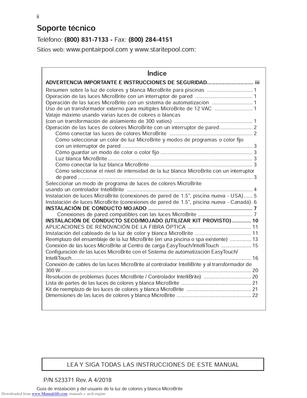 Resolución de problemas (luces MicroBrite / Controlador IntelliBrite) ................................. 20