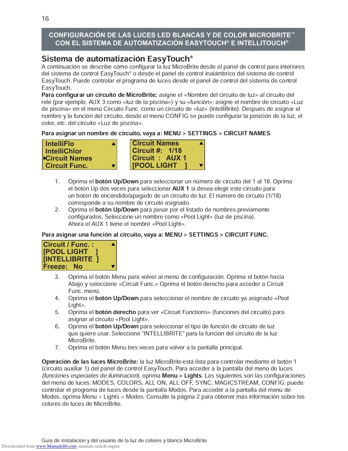 de piscina» en el menú Circuito Func. como un circuito de «luz» (IntelliBrite). Después de asignar el