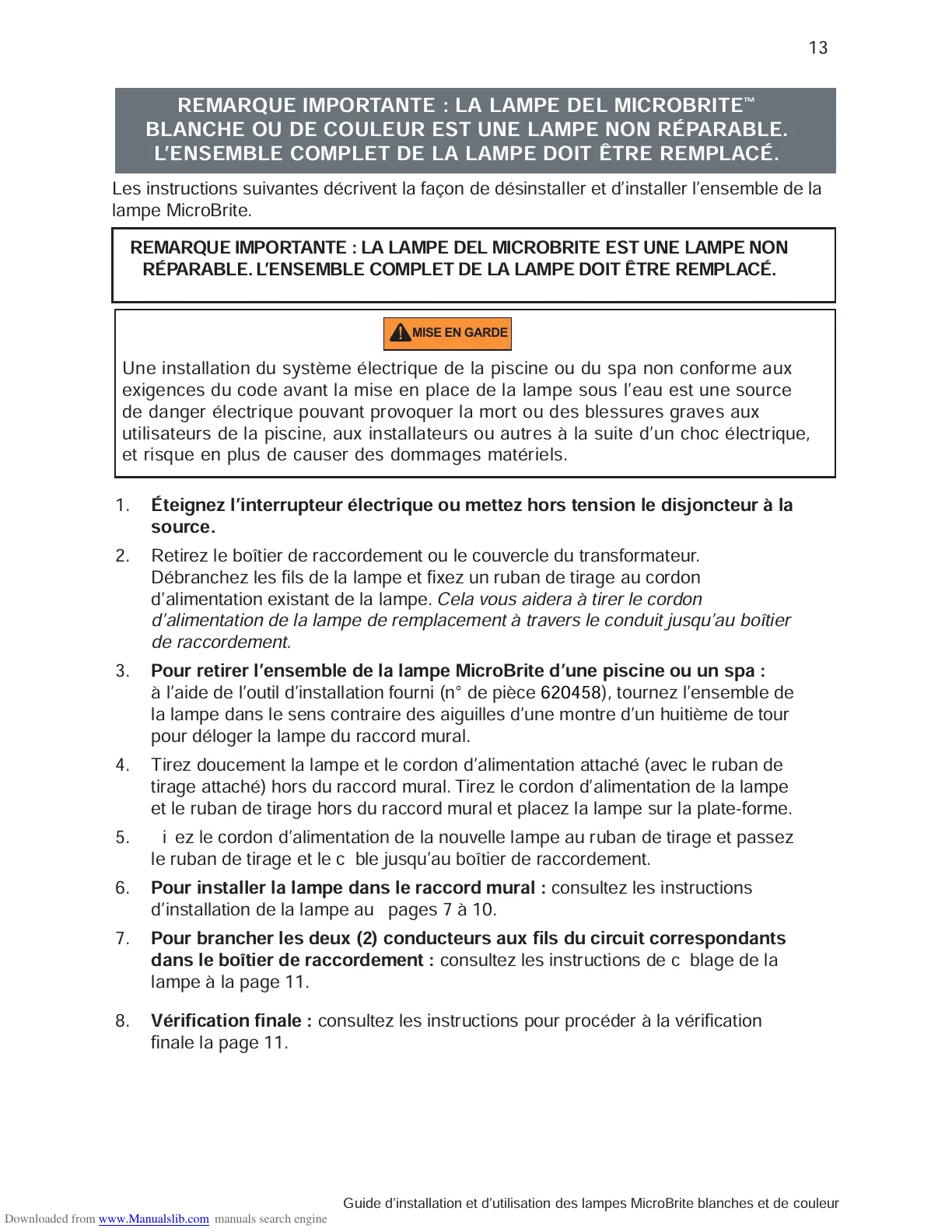 Pour retirer l’ensemble de la lampe MicroBrite d’une piscine ou un spa :